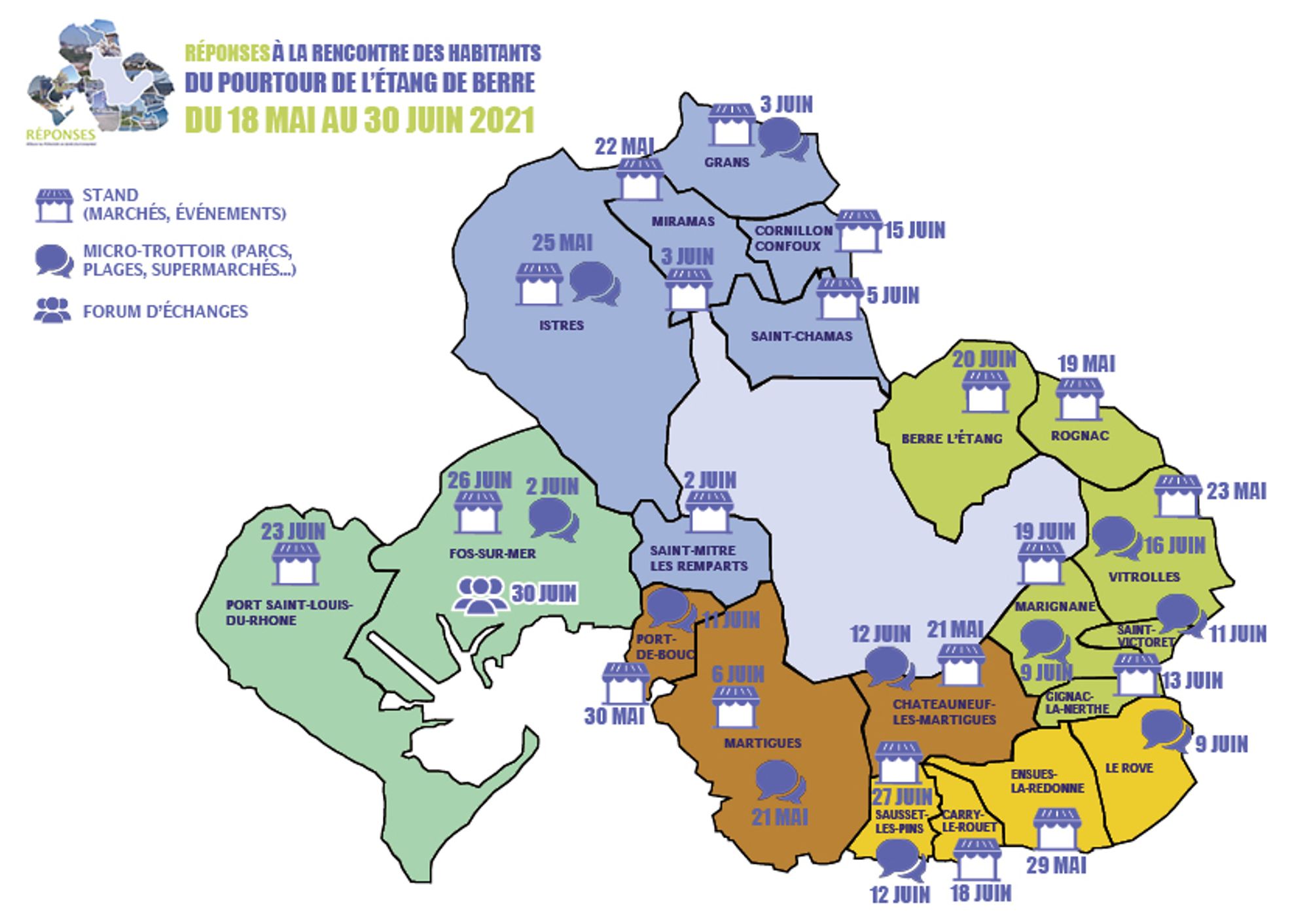 Après une première concertation citoyenne en 2019 qui a permis d’élaborer un plan d’actions pour répondre aux 120 attentes exprimées par les habitants, RÉPONSES retourne sur le terrain, à la rencontre des habitants des 21 communes du pourtour de l’étang de Berre du 18 mai au 31 juin 2021.