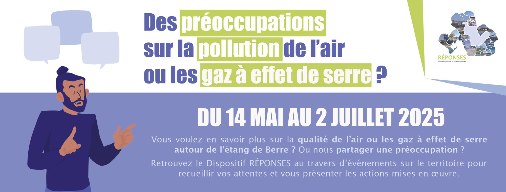 Jusqu’au 2 juillet 2025, tous les citoyens du pourtour de l’étang de Berre sont invités à venir dialoguer et échanger dans le cadre du dispositif RÉPONSES. Autour d’un stand ou lors de micro-trottoir, vous pourrez exprimer vos préoccupations concernant la pollution de l’air ou les gaz à effet de serre, découvrir ou mieux connaître le dispositif RÉPONSES et les actions mises en œuvre sur le territoire. Ces préoccupations seront ensuite transmises à ceux qui peuvent agir pour y apporter des réponses concrètes.