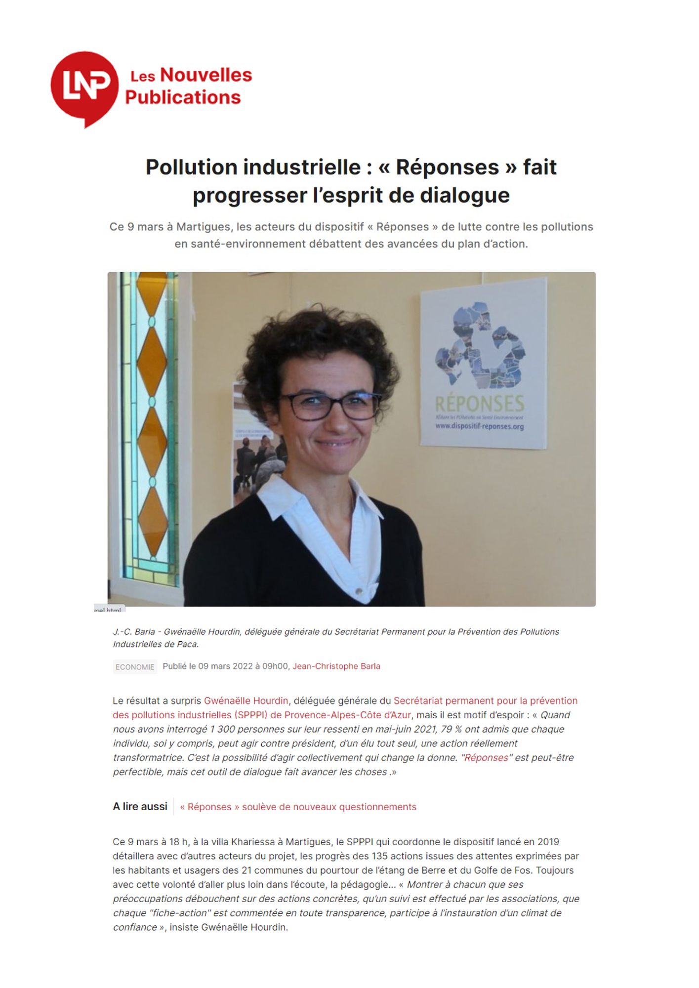 Ce 9 mars à 18 h, à la villa Khariessa à Martigues, le SPPPI qui coordonne le dispositif lancé en 2019 détaillera avec d’autres acteurs du projet, les progrès des 135 actions issues des attentes exprimées par les habitants et usagers des 21 communes du pourtour de l’étang de Berre et du Golfe de Fos. Toujours avec cette volonté d’aller plus loin dans l’écoute, la pédagogie… « Montrer à chacun que ses préoccupations débouchent sur des actions concrètes, qu’un suivi est effectué par les associations, que chaque "fiche-action" est commentée en toute transparence, participe à l’instauration d’un climat de confiance »
