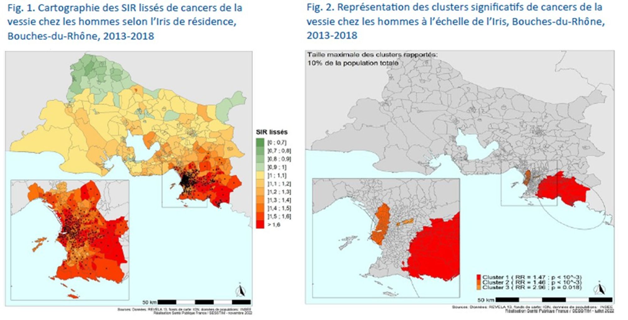 Il n’est pas observé de surincidence, pour les 3 cancers, dans les Iris (correspondant à des quartiers) du pourtour de l’Etang de Berre par rapport aux autres Iris du département. En revanche, une surincidence du cancer de la vessie est observée dans des communes et Iris densément peuplés, et pour lesquels un tabagisme important est estimé, avec l’identification de clusters sur ces zones, situées à Marseille et au sud-est du département. Ces résultats suggèrent l’existence d’expositions environnementales et de déterminants communs à ces zones.
