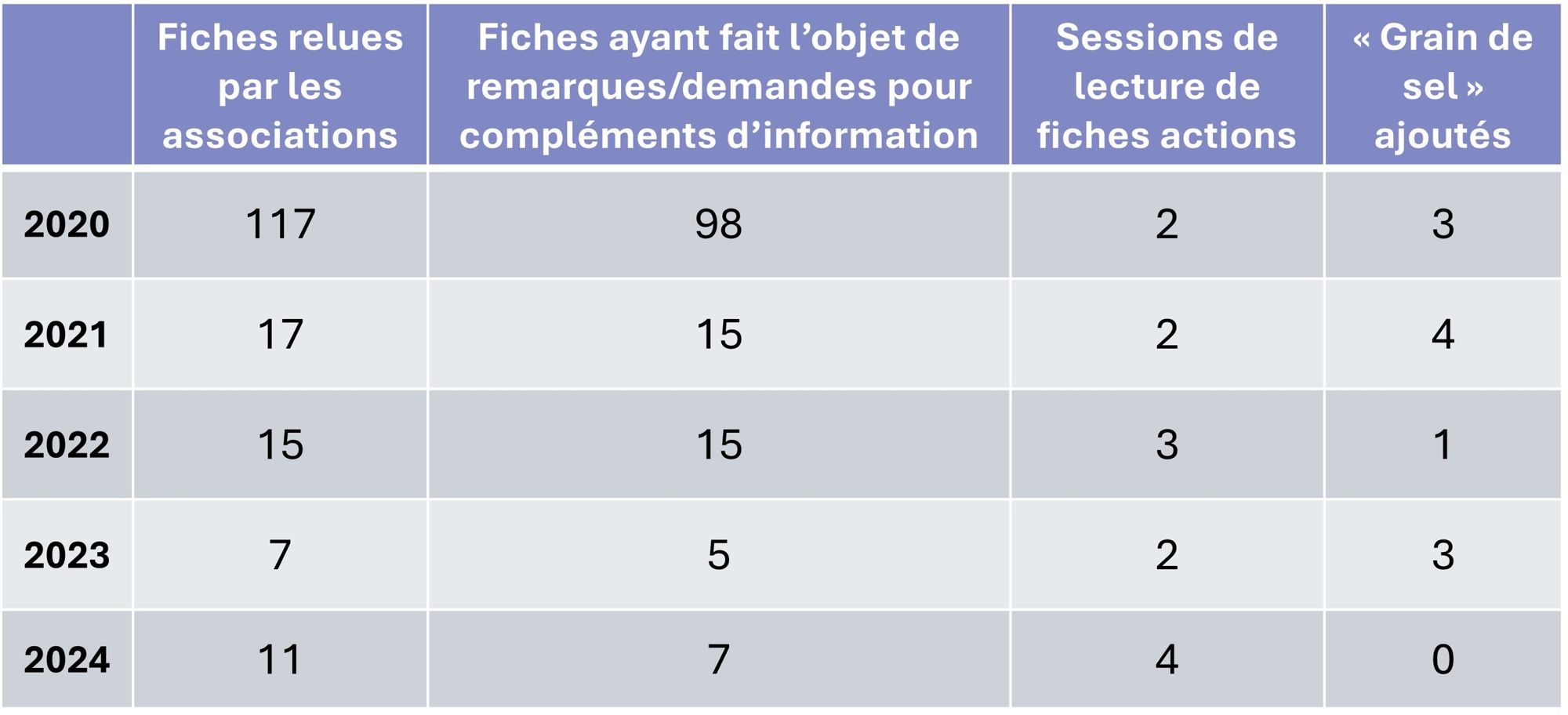 Nombre de fiches actions relues par les associations, et ayant fait l'objet de remarques/demandes pour complément d'information, nombre de « Grain de sel » ajoutés aux fiches actions, et nombre de sessions de lecture des fiches actions