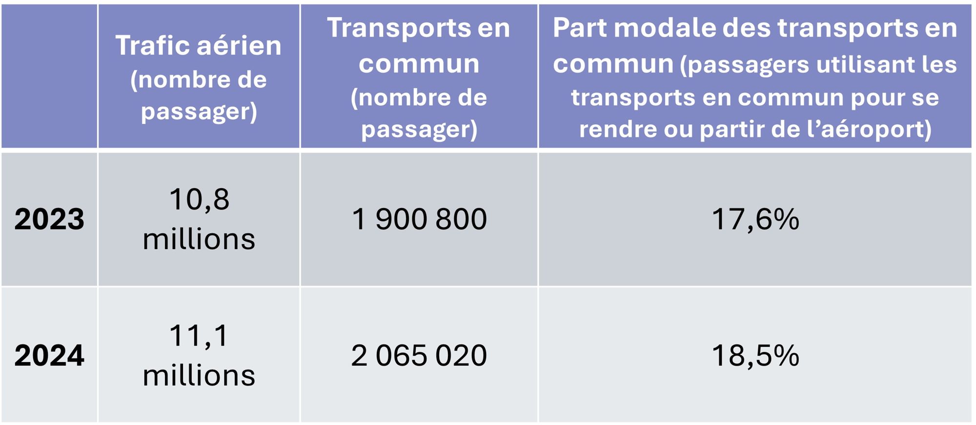Évolution du trafic aérien, du trafic des transports en commun et de la part modale des transports en commun dans les accès à l’aéroport