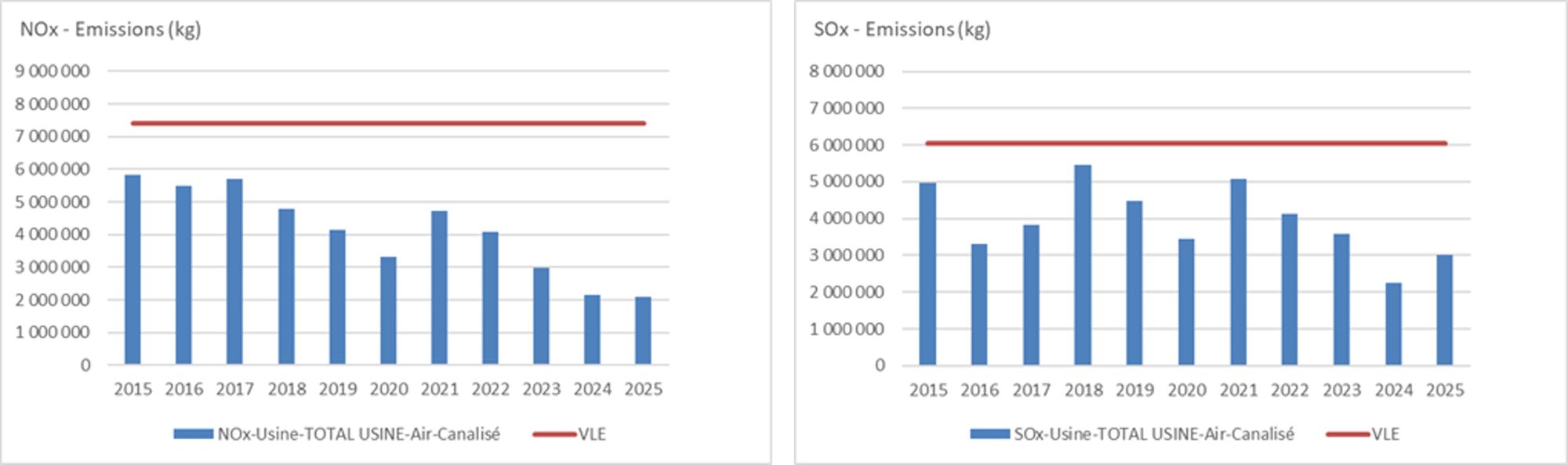 En 2022 : Les résultats pour les SOx et NOx sont globalement au niveau de ceux de 2019 (résultats 2020 liés à la baisse d’activité). Le site a connu de fortes perturbations au cours de l'année, qui ont eu un retentissement important sur la marche des installations (entrainant de fréquents arrêts de hauts fourneaux).