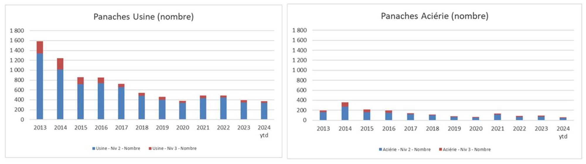 Entre 2013 et 2024 : ArcelorMittal a enregistré une baisse de 76,5% des panaches usines de niveaux 2 et 3, et une baisse de 71,3% des panaches aciérie de niveaux 2 et 3.