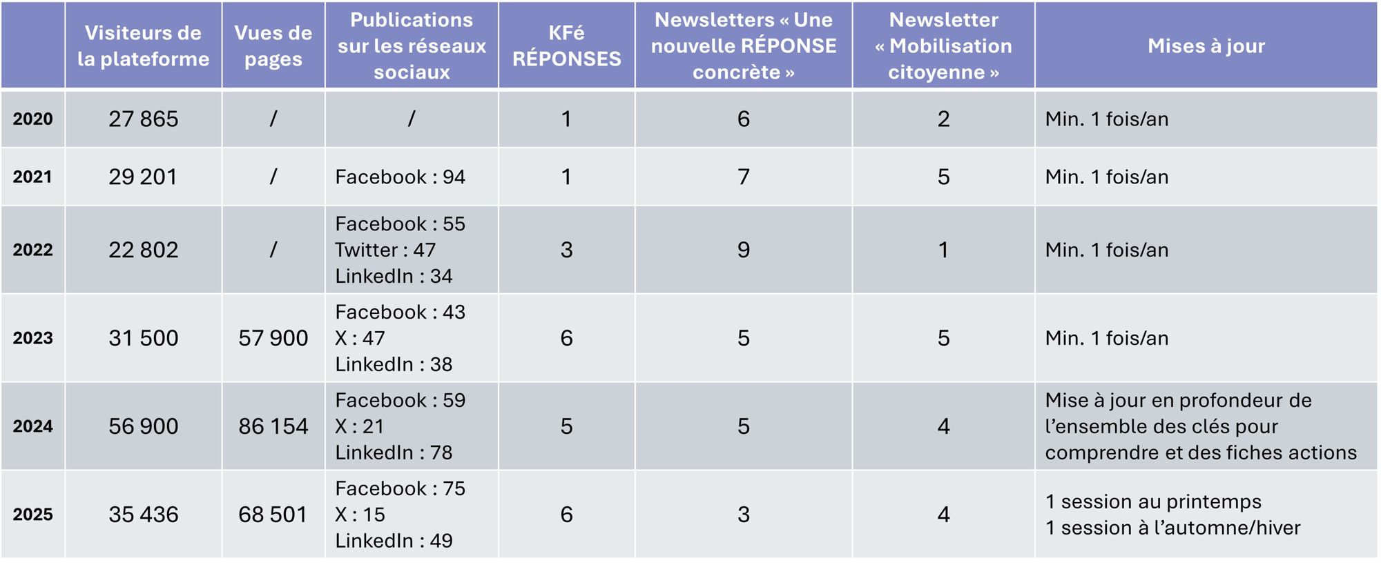 Fréquentation de la plateforme RÉPONSES, nombre de publications sur les réseaux sociaux, de KFé RÉPONSES organisés, et de newsletters publiées, et mises à jour des fiches action et de la plateforme