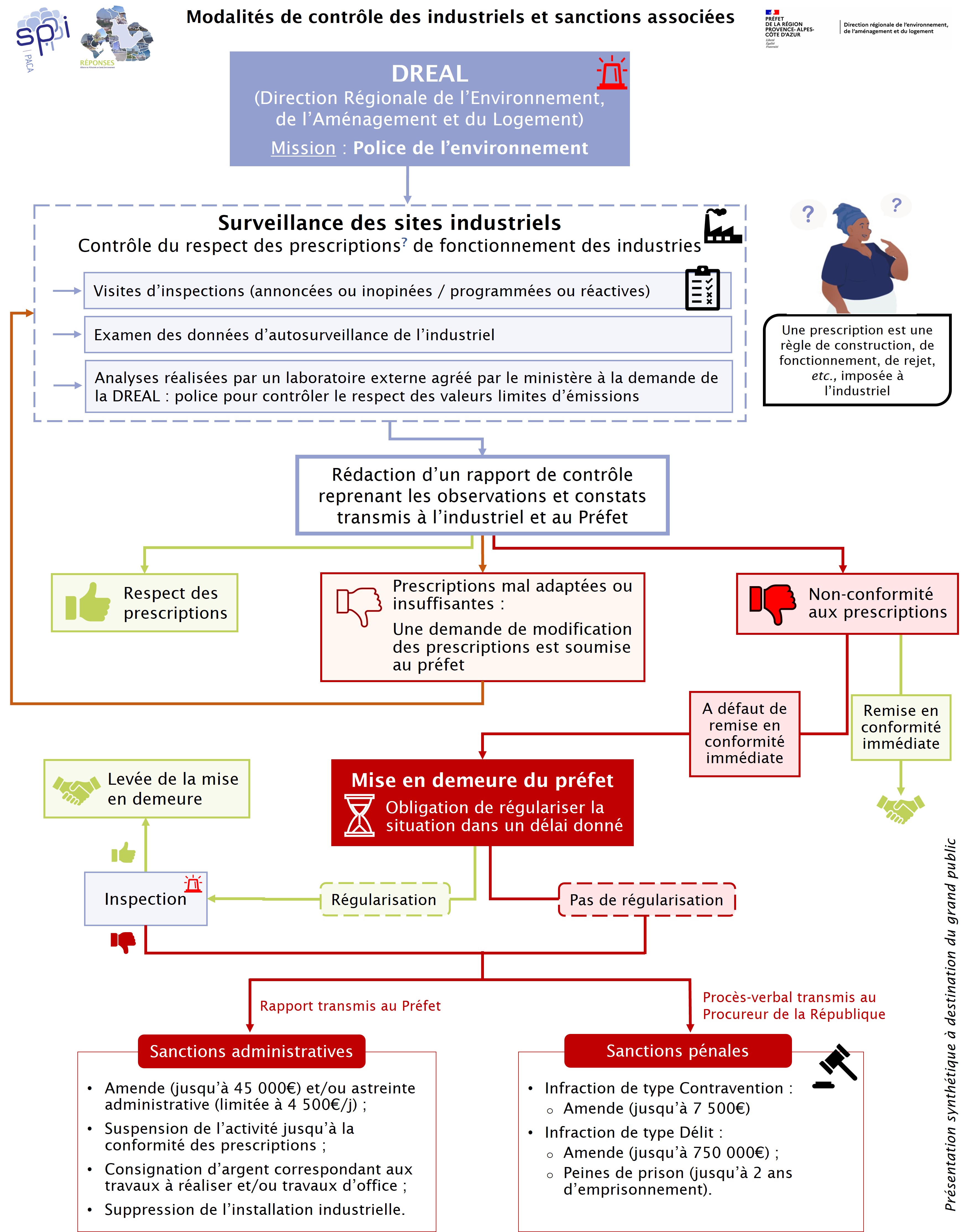 L'inspection des Installations Classées pour la Protection de l'Environnement effectue régulièrement des contrôles des installations industrielles. L’objectif de ces contrôles est de vérifier le respect des conditions de fonctionnement figurant soit dans l’arrêté préfectoral spécifique à l’installation industrielle, soit dans un arrêté ministériel concernant le secteur d’activité industriel concerné. Les constats d'inspection sont transmis au Préfet. En cas de manquement, ils peuvent donner lieu à des sanctions envers les industriels ou à un arrêté préfectoral complémentaire visant à adapter ou compléter les prescriptions.