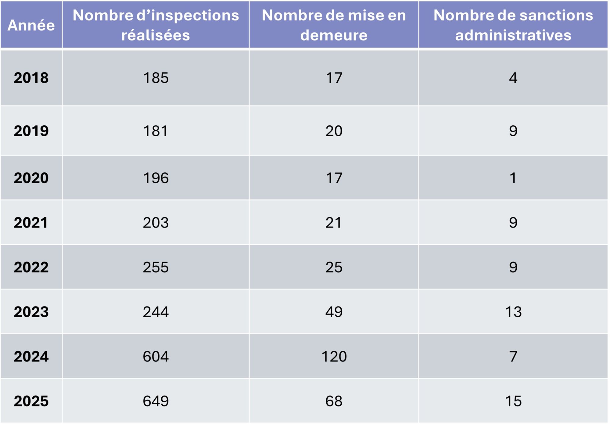 Nombre d'inspections réalisées, de mises en demeure et de sanctions administratives prononcées depuis 2018 dans les Bouches-du-Rhône