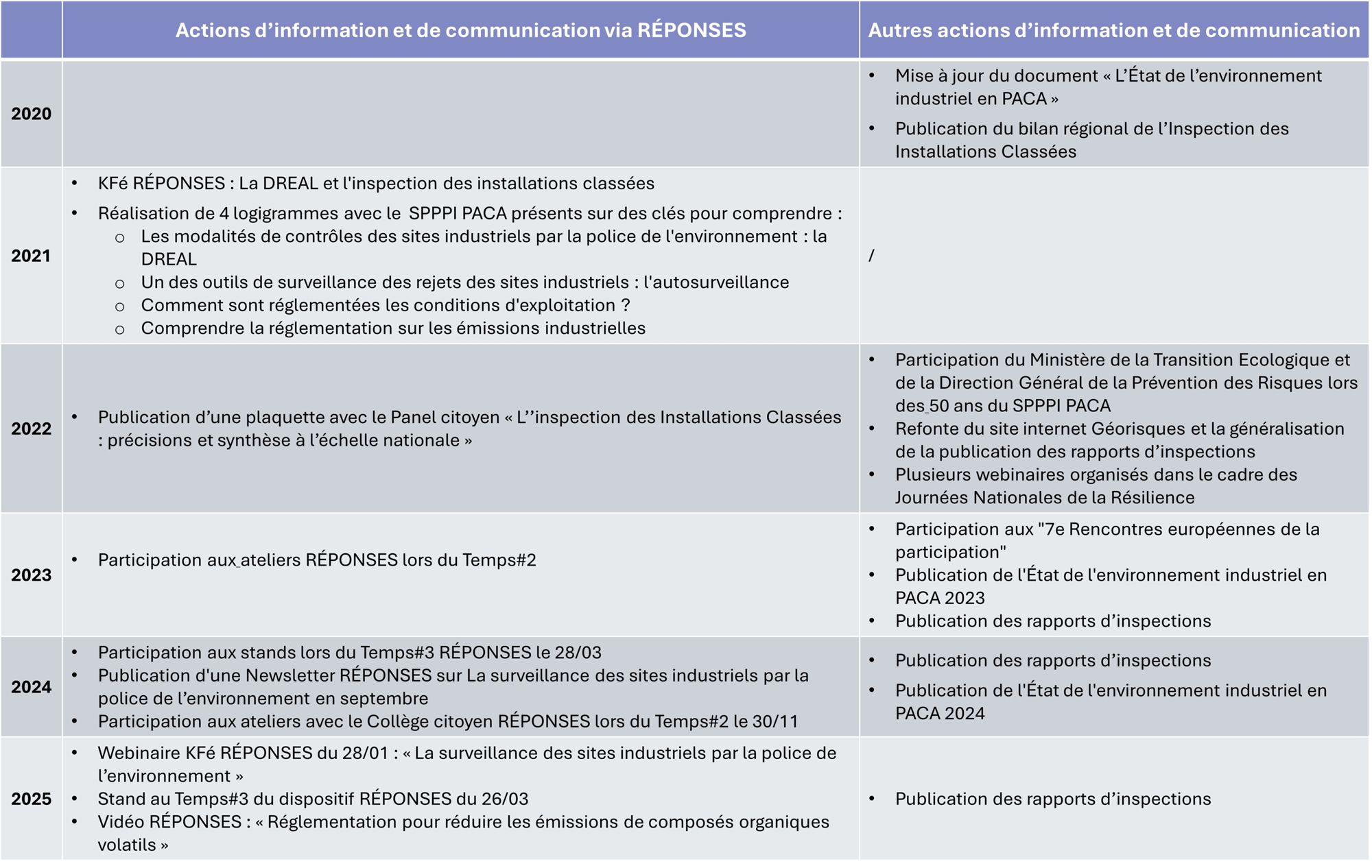 En réponse, la Direction Régionale de l'Environnement, de l'Aménagement et du Logement PACA propose d’améliorer la diffusion de l’information, de développer des supports didactiques permettant d’expliquer le rôle de l’inspection des installations classées et ses moyens d’action, de communiquer un bilan périodique d’activités de l’inspection des installations classées faisant état de différents indicateurs.