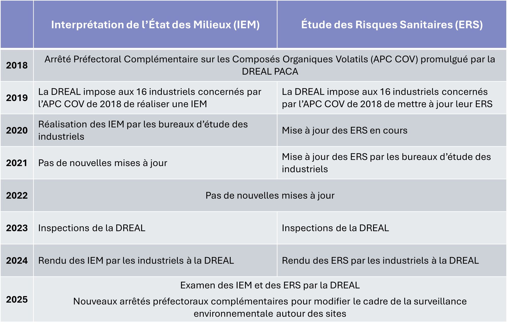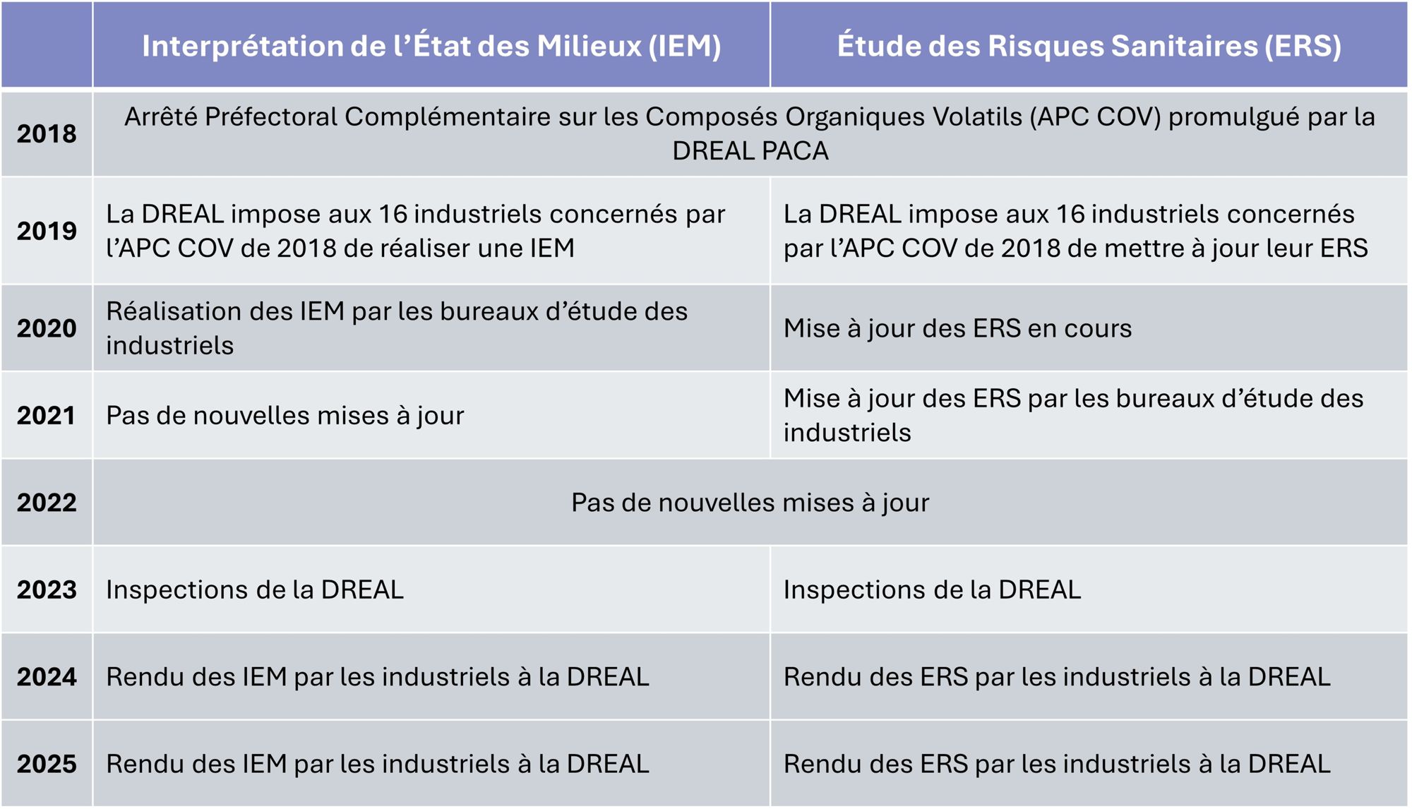 Réalisation et mise à jour des Interprétation de l'État des Milieux d'Étude de Risques Sanitaires réalisées par les industriels dans le cadre de l'Arrêté Préfectoral Complémentaire sur les Composés Organiques Volatils, inspections et examens des études par l'Inspection des Installations Classées de la DREAL PACA
