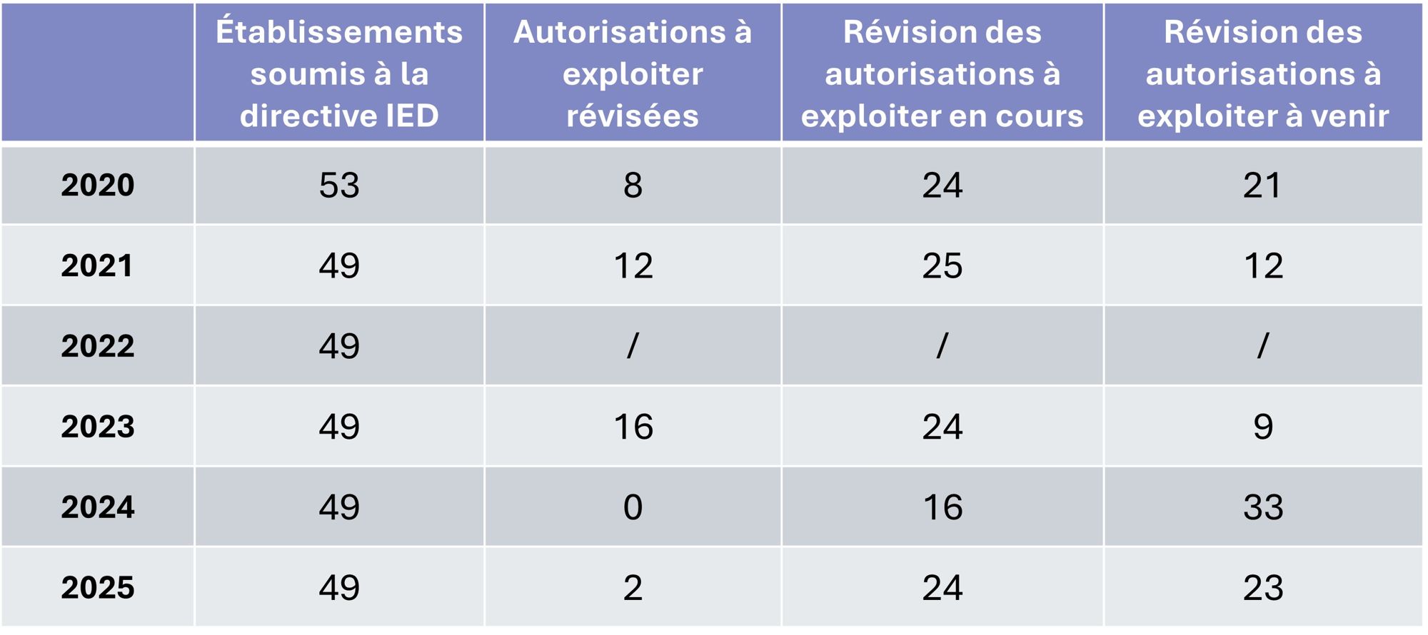 En 2021 : Suite à la parution de BREFs pour les secteurs des déchets, de la chimie organique et des grandes installations de combustion, une importante vague de réexamen a débuté. Les réexamens se déroulent sur plusieurs années.
