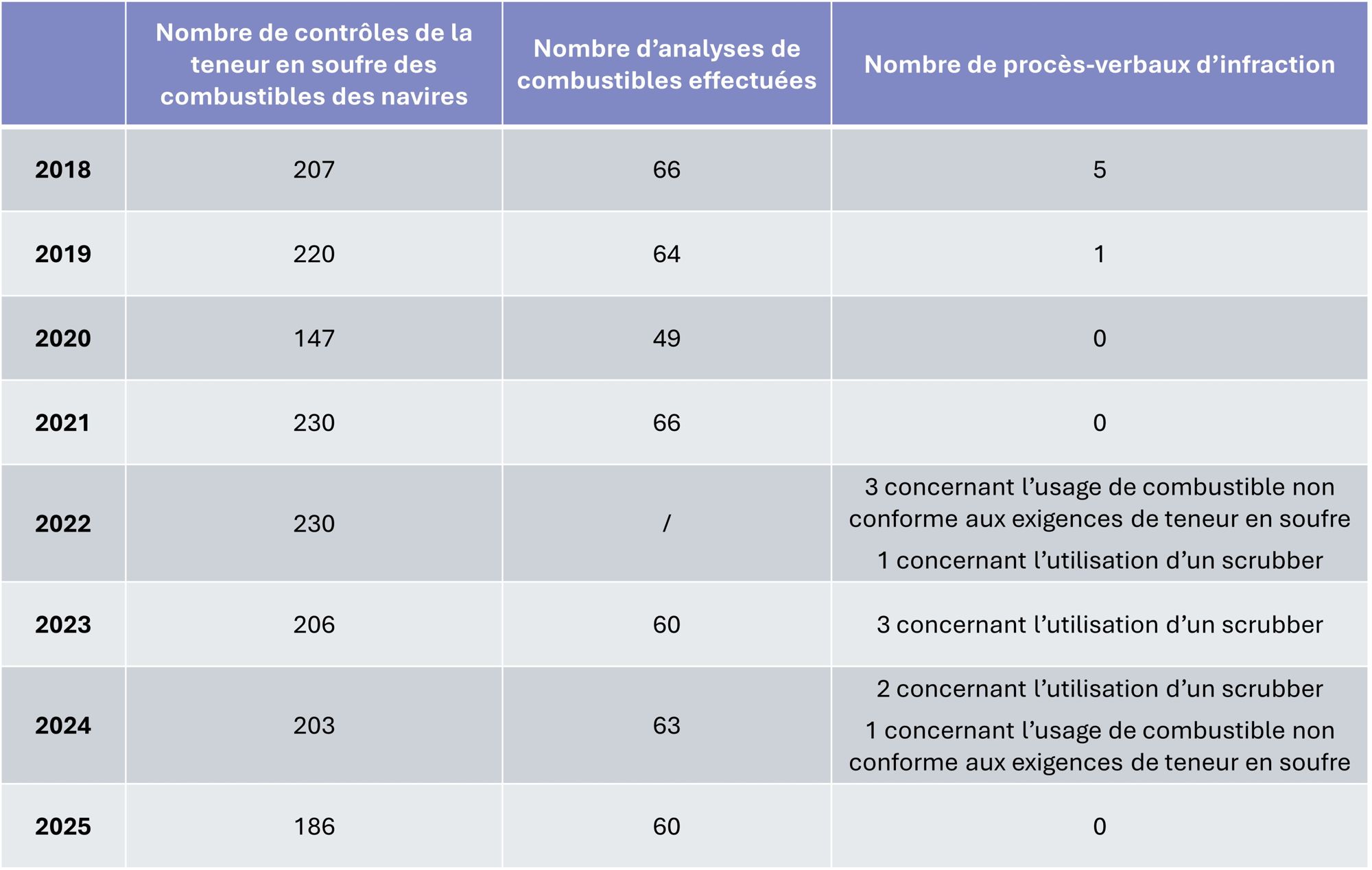 En 2025 : Sur l’ensemble des inspections aucun navire n’a fait l’objet d’un procès-verbal transmis au parquet pour des poursuites judiciaires. Cela traduit une meilleure connaissance de la réglementation nationale concernant l’interdiction de l’usage des scrubbers à boucle ouverte dans les 3 milles nautiques, ainsi que l’absence de difficulté à obtenir un combustible conforme à 0.1% depuis l’entrée en vigueur de la zone de réglementation des émissions de polluants (zone ECA) en Méditerranée en mai 2025.