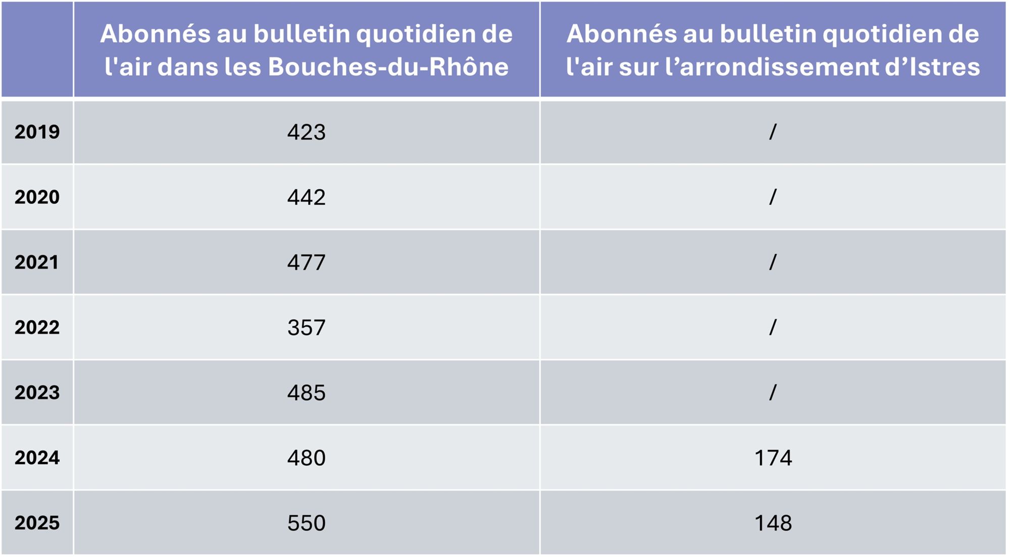 Nombre d’abonnements au bulletin quotidien de l'air dans les Bouches-du-Rhône et sur l'arrondissement d'Istres