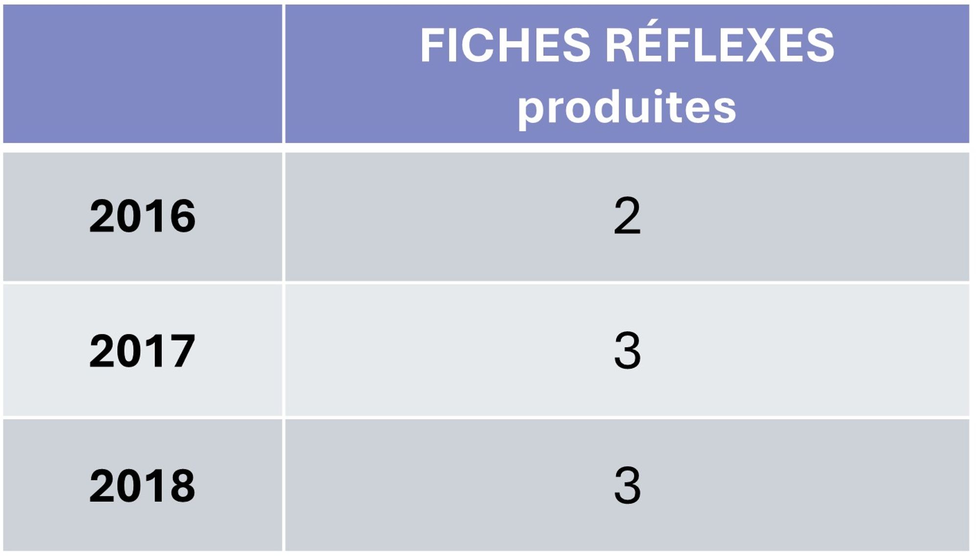 Depuis 2019, la crise sanitaire et la mobilisation du syndicat sur d’autres thématiques d’actualité n’a pas permis de produire de nouvelles fiches Réflexes. L’action est arrêtée pour le moment, même si la volonté du syndicat de s’engager sur ce sujet perdure.