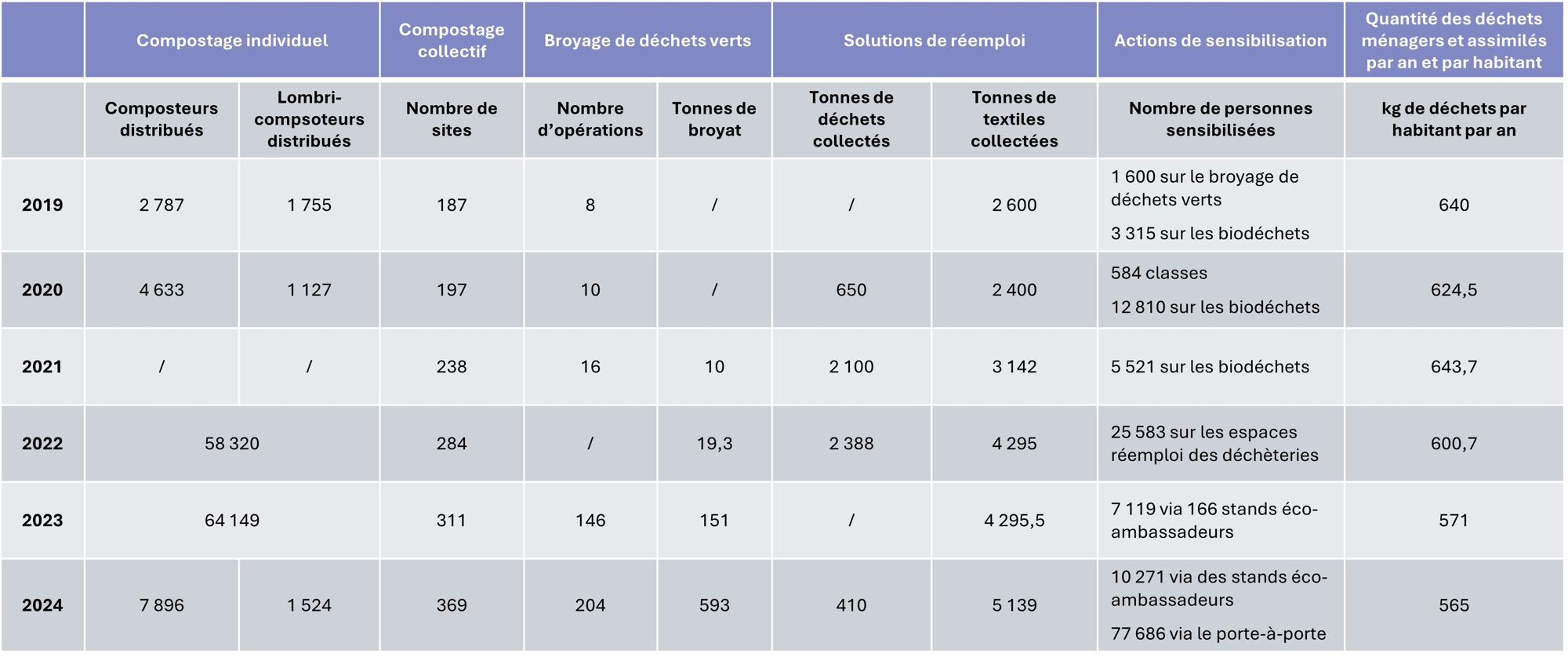 Solutions de composatage individuel et collectif, de broyage des déchets verts, de réemploi, et actions de sensibilisation menées par la Métropole Aix-Marseille-Provence pour réduire le ratio de quantité de déchets ménagers et assimilés par habitant