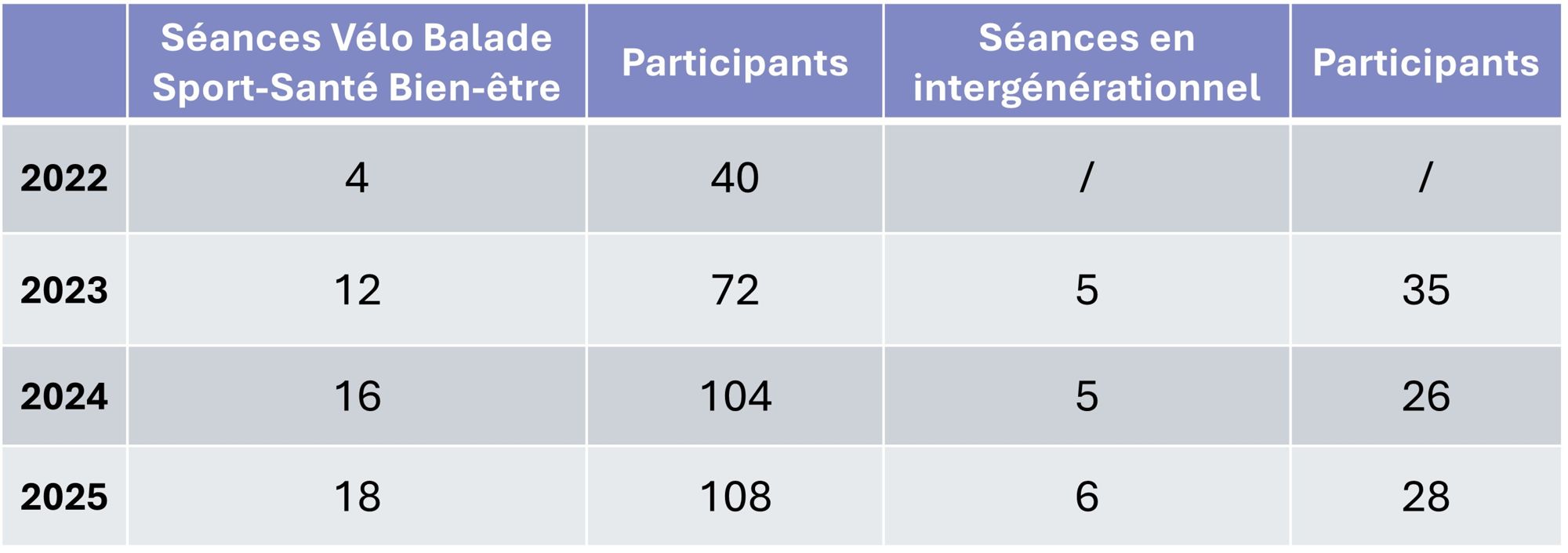Nombre de séances Vélo Balade Sport-Santé Bien-Être et de séances intergénérationnelles dispensées, et nombre de participants