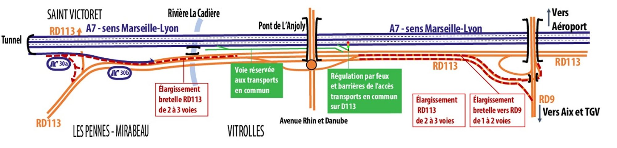 Concernant la D113 (sens Aéroport-Marseille) : Les aménagements sont sous maîtrise d’ouvrage du Conseil Départemental des Bouches-du-Rhône.