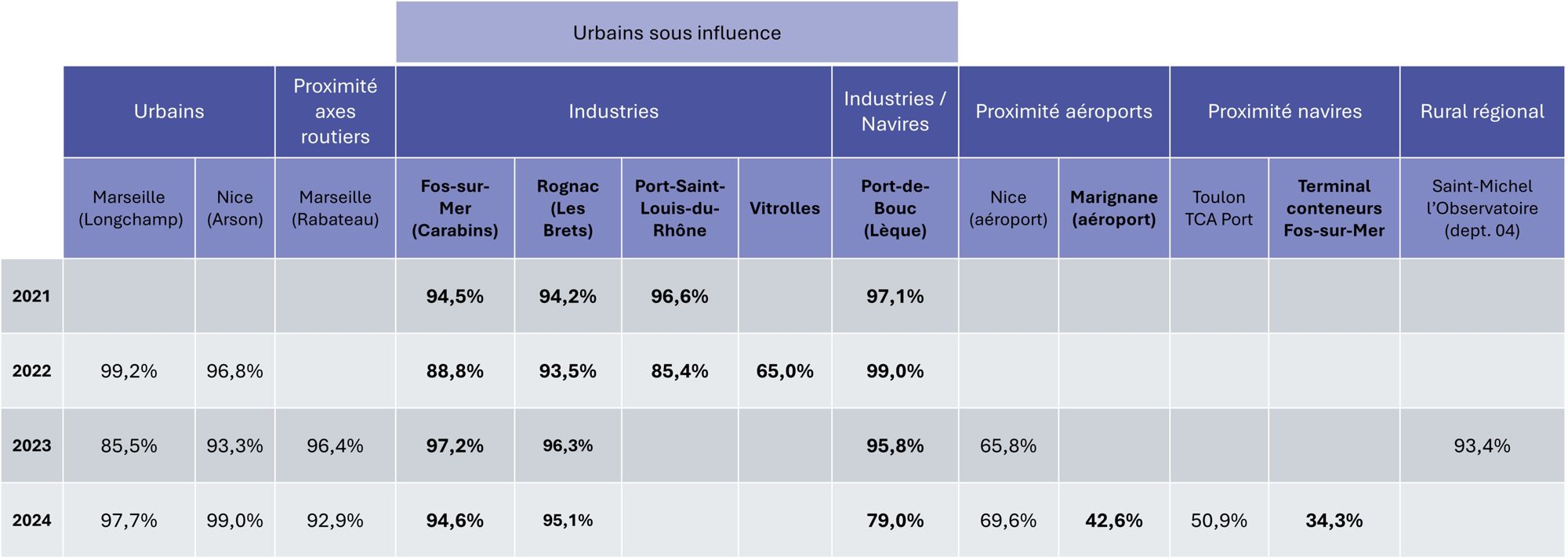 En 2024, une surveillance temporaire a été menée à proximité de l’aéroport Marseille-Provence. Deux nouveaux sites de mesures ont été créés à proximité de grandes sources maritimes, l’un sur le port de Toulon et l’autre au niveau des terminaux conteneurs de Fos-sur-mer.