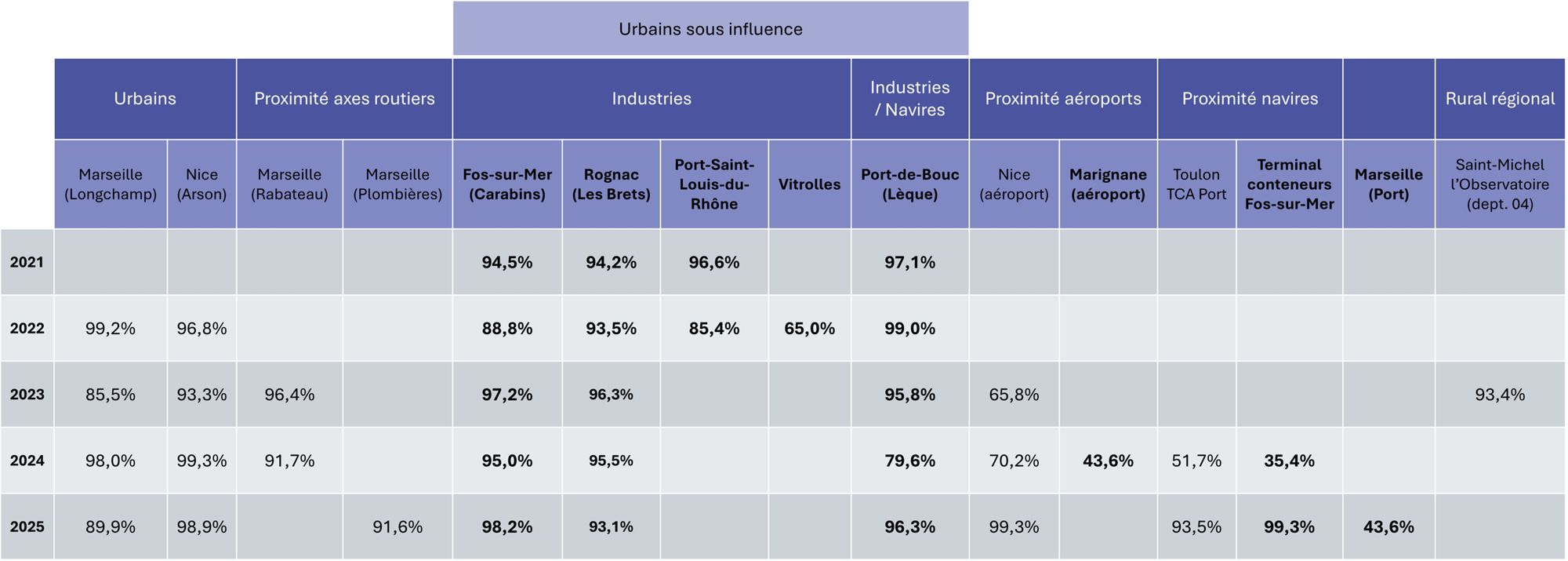 À Nice aéroport (69,6%), Toulon TCA Port (50,9%), et au terminal conteneur de Fos-sur-Mer (34,3%) car démarrage des mesures en cours d'année.