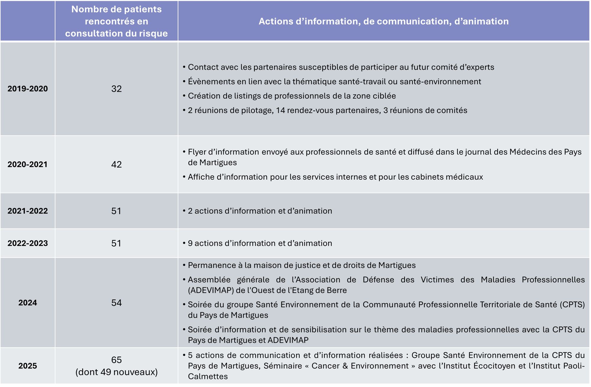 Nombre de patients rencontrés en consultation du risque, et nombre d'actions d'information, de communication et d'animation menées depuis 2019