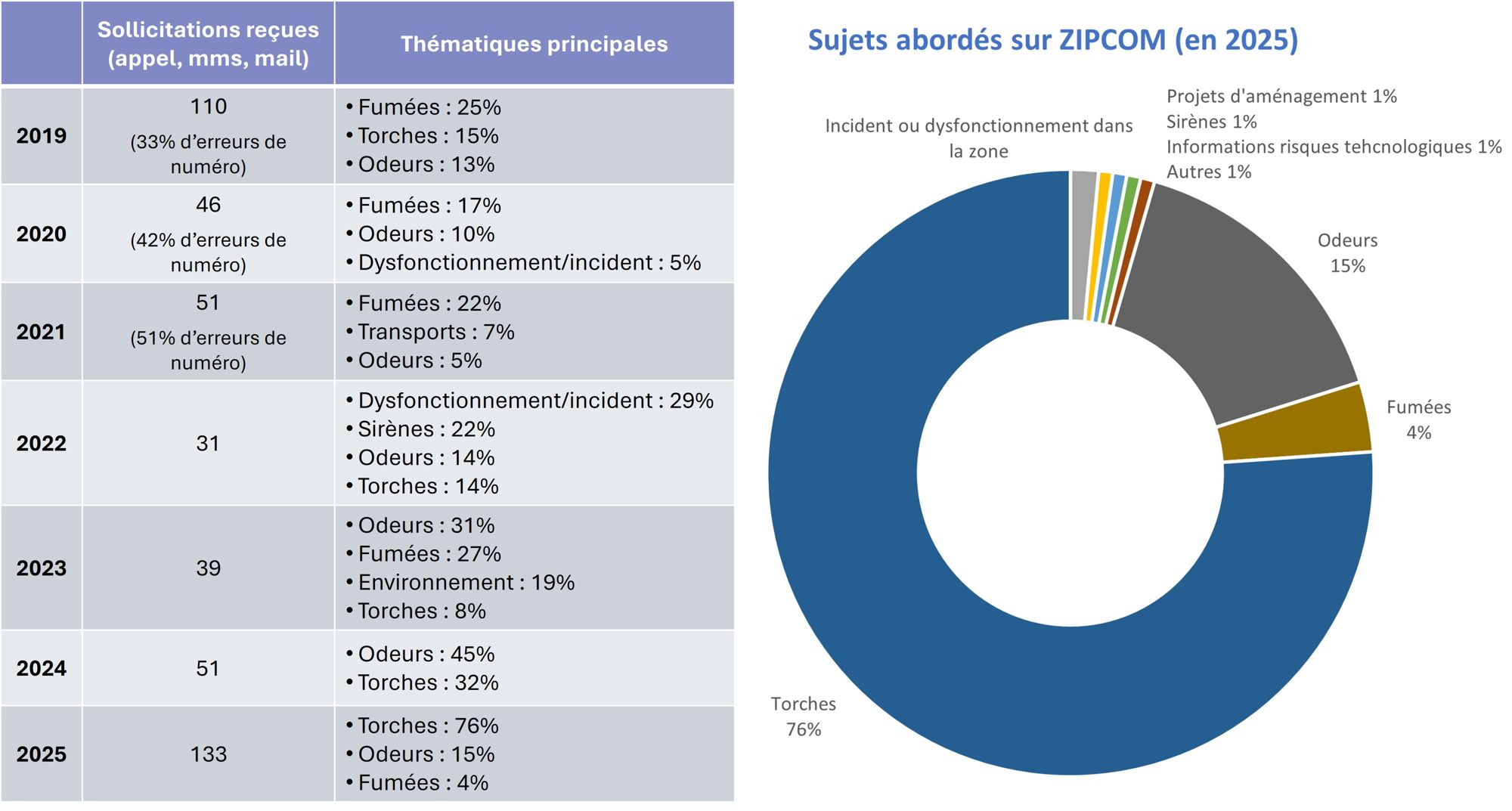 Nombre de sollicitations (appels, mms, mails) reçues via le dispositif ZIPCOM, et thématiques principales abordées