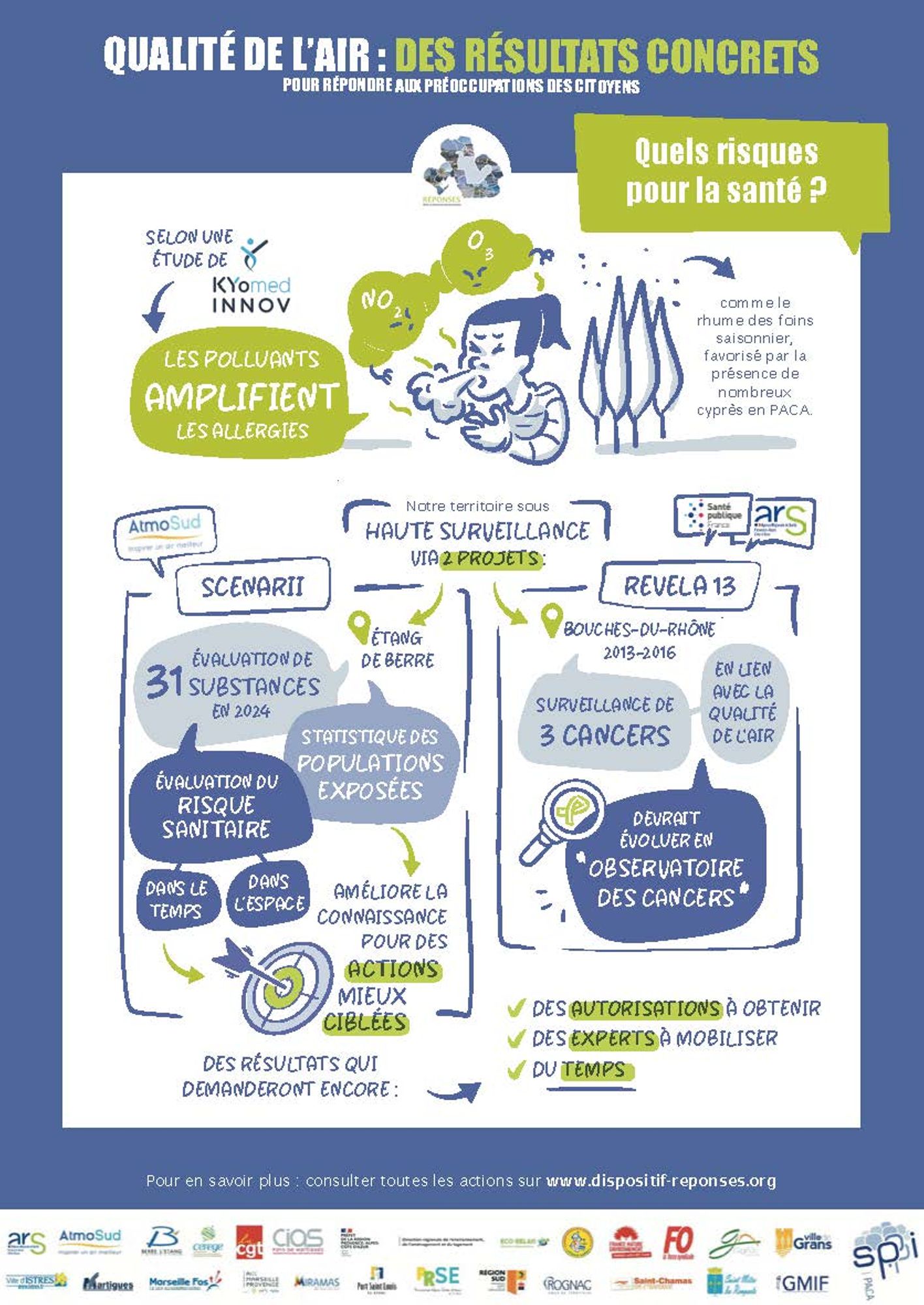 - D'études comme la récente étude Mistral, réalisée par KYomed INNOV, qui montre que les polluants atmosphériques amplifient les allergies, notamment l’ozone (O3) seul ou en association avec le dioxyde d’azote (NO2). C’est par exemple le cas du rhume des foins saisonnier, favorisé par la présence de nombreux cyprès en PACA.
