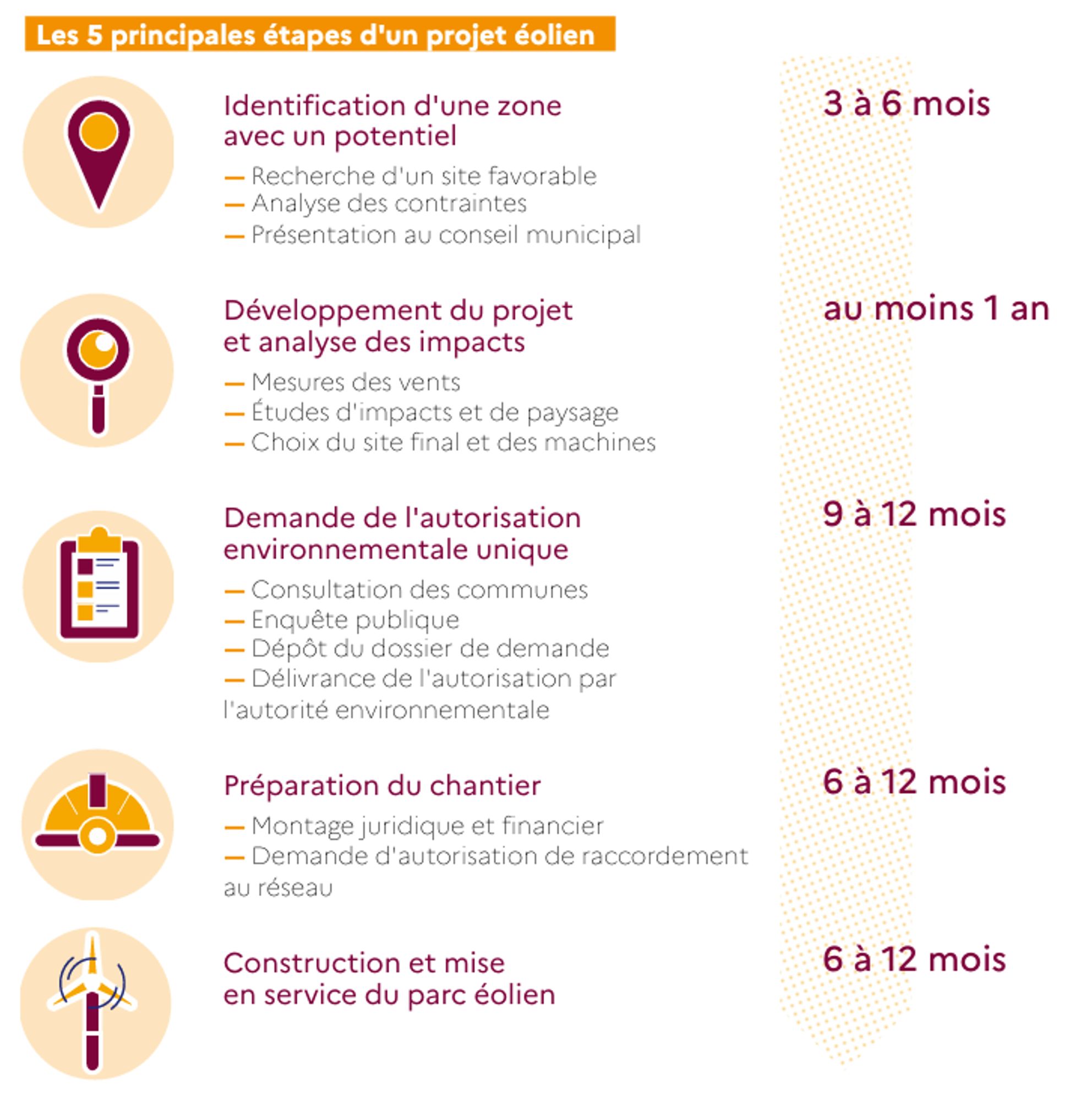 La mise en place d’un parc éolien prend entre 4 et 10 ans, suivant les caractéristiques locales et l’adhésion ou non des populations.