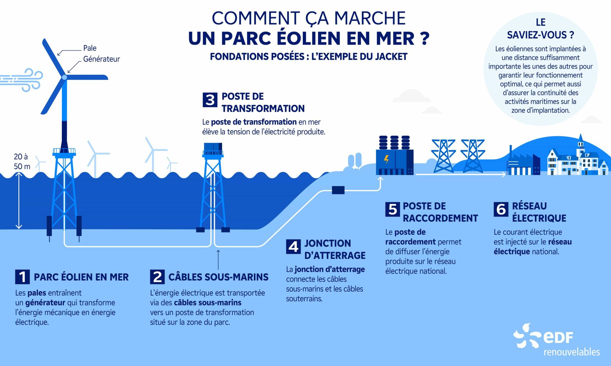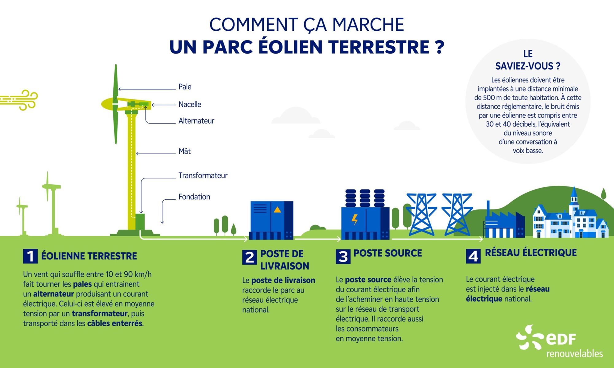 Une éolienne produit de l'électricité grâce au vent qui fait tourner les pales qui mettent en mouvement un rotor, permettant sa transformation en énergie mécanique. Cette énergie mécanique est ensuite transmise au générateur qui produit du courant électrique.