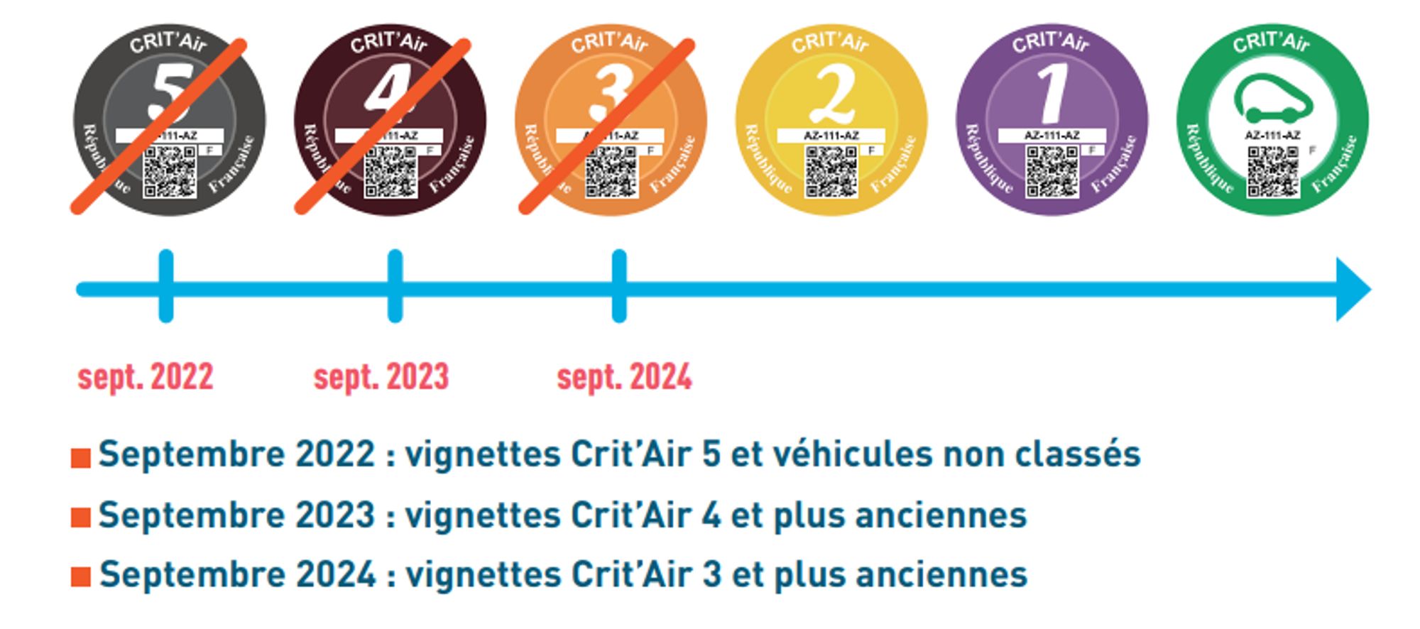 - Depuis le 1er septembre 2023 : les véhicules équipés d’une vignette Crit’Air 4 et plus anciennes ne sont pas autorisés à circuler ou à stationner dans le périmètre de la ZFE ;