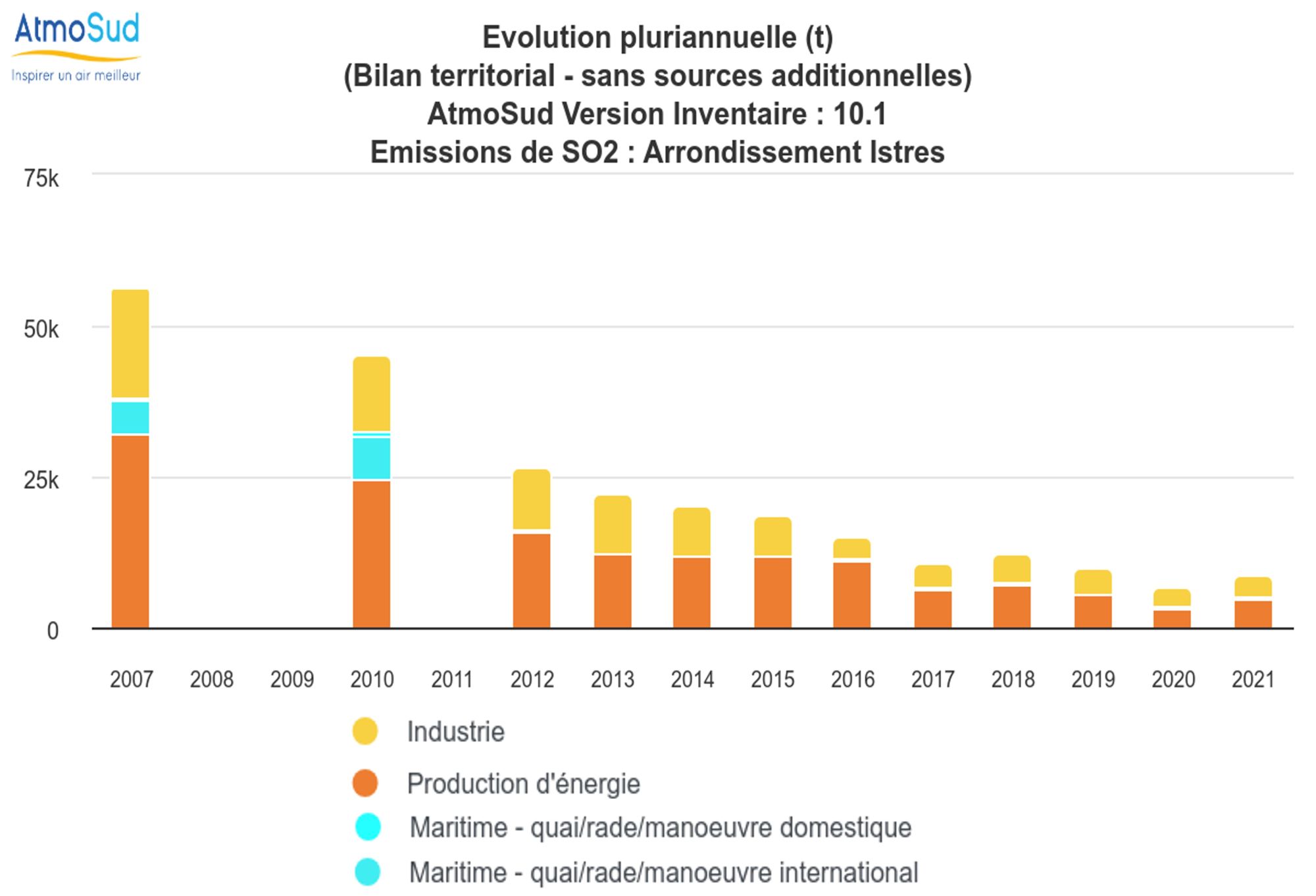 - Plus aucun dépassement en SO2 dans le territoire n'a eu lieu depuis 2010, alors qu’en 2003 450 heures de dépassement ont été comptabilisées. Les quantités émises par les industrielles ont fortement diminué et la diminution des niveaux de fonds se poursuit. Il y a donc eu une nette amélioration de la pollution soufrée.
