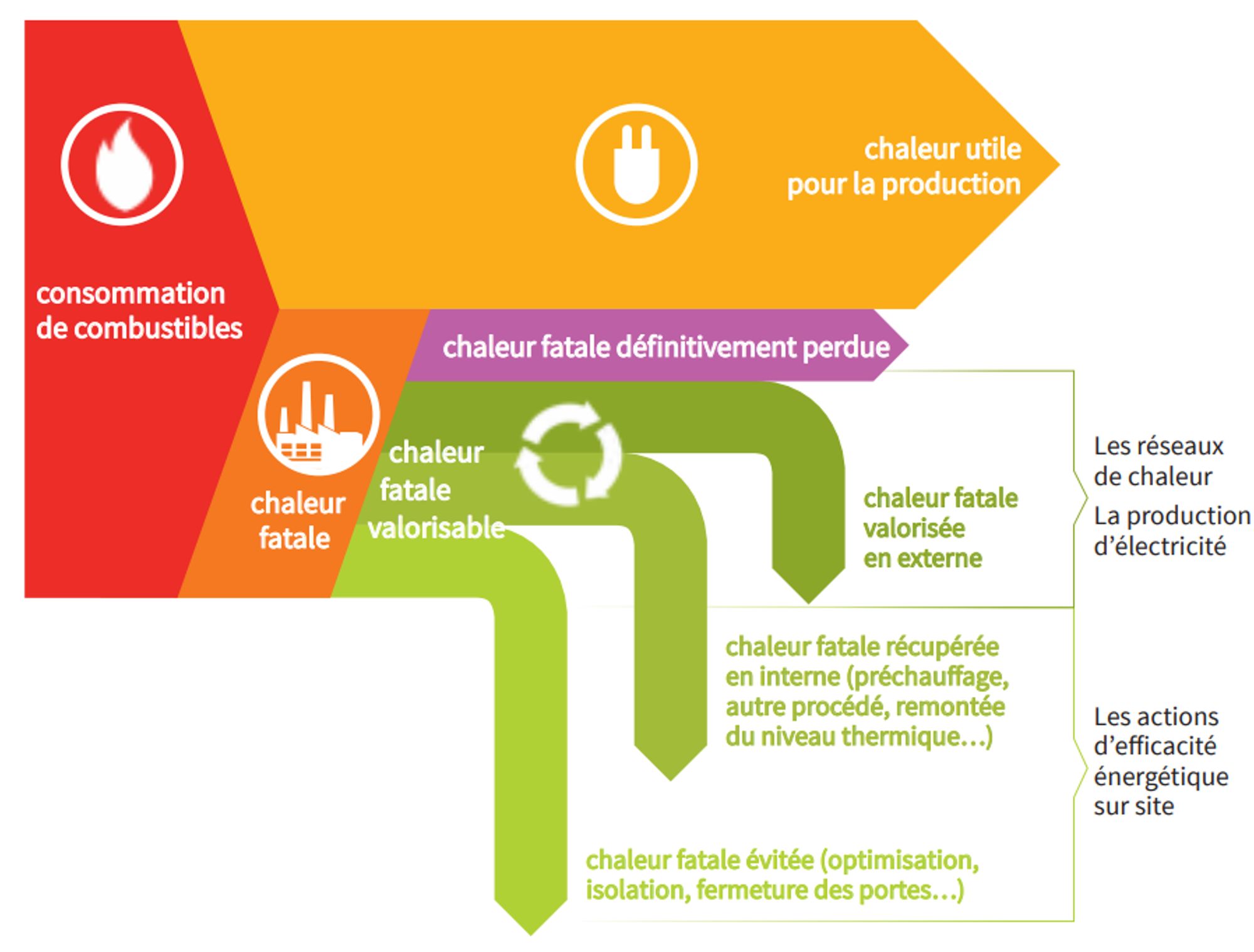 - Récupérer la chaleur fatale provenant des fumées ou des effluents industriels, et la valoriser pour les besoins de chaleur de l’entreprise elle-même (réutilisation interne) ou pour une autre entreprise (réseau de vapeur/chaleur) ou pour des bâtiments (réseau de chaleur urbain) ;