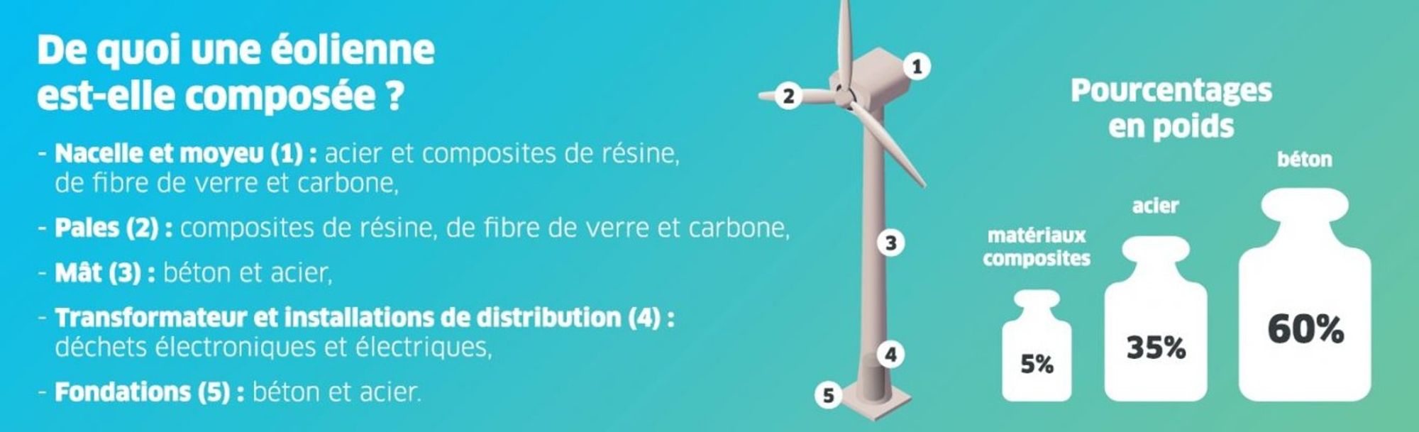 Selon l’Agence de la transition écologique (ADEME), une éolienne est recyclable à plus de 90 % :