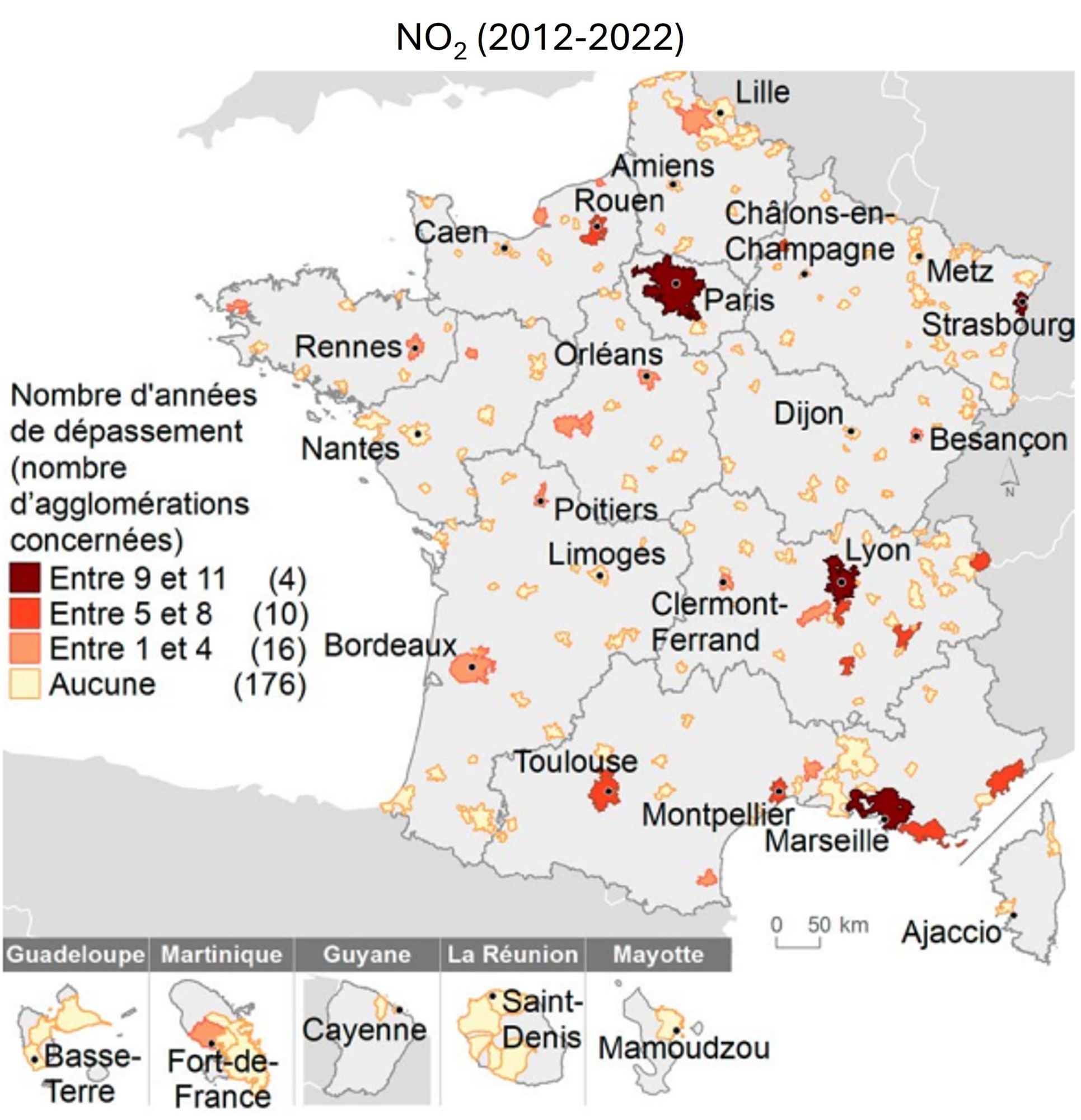 - NO2 : " 169 agglomérations ont toujours respecté les seuils réglementaires fixés pour le NO2 pour la protection de la santé sur la période 2000-2022. À l’inverse, les agglomérations de Lyon et de Paris enregistrent des dépassements chaque année. Marseille – Aix-en-Provence et Strasbourg arrivent juste derrière avec 21 années de dépassement des seuils réglementaires. Après plusieurs années avec des dépassements de seuils, la situation s’est récemment améliorée pour certaines agglomérations. Par exemple, pour Chamonix – Mont-Blanc, Grenoble, Reims et Toulouse, aucun dépassement n’a été mesuré depuis 2020. Il en est de même pour Montpellier et Nice depuis 2019, Toulon, Valence et Vienne depuis 2018 ou encore Clermont-Ferrand depuis 2017. De même, l’agglomération de Marseille – Aix-en-Provence ne fait pas l’objet de dépassement de seuil en 2020 et 2022 tout comme l’agglomération de Rouen".