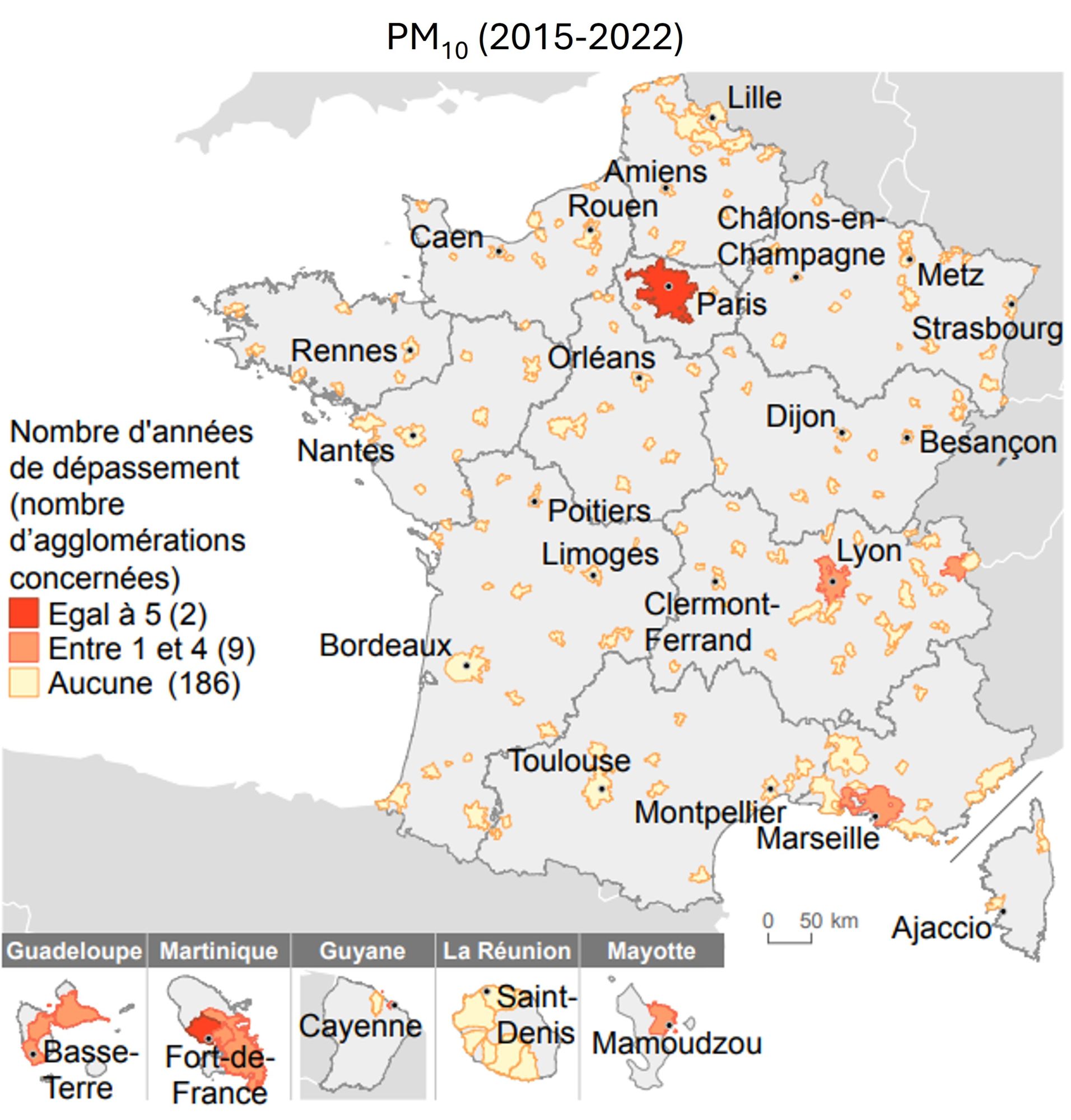 - PM10 : " 153 agglomérations ont toujours respecté les seuils réglementaires fixés pour la protection de la santé sur la période 2007-2022. L’agglomération de Paris respecte ces seuils depuis 2020. Plus aucun dépassement n’est mesuré à Sallanches depuis 2017 (après 10 années de dépassement), à Lyon depuis 2016 (après 8 années de dépassement sur la période 2007-2015), ainsi qu’à Grenoble et Strasbourg depuis 2014. À Marseille – Aix-en-Provence, après une amélioration de la situation depuis 2014, la réglementation n’est à nouveau pas respectée en 2022. Toutefois la contribution naturelle liée aux brumes des sables est substantielle en 2022 sur les PM10 à Marseille, et, sans cette contribution naturelle, les seuils réglementaires n’auraient pas été dépassés."