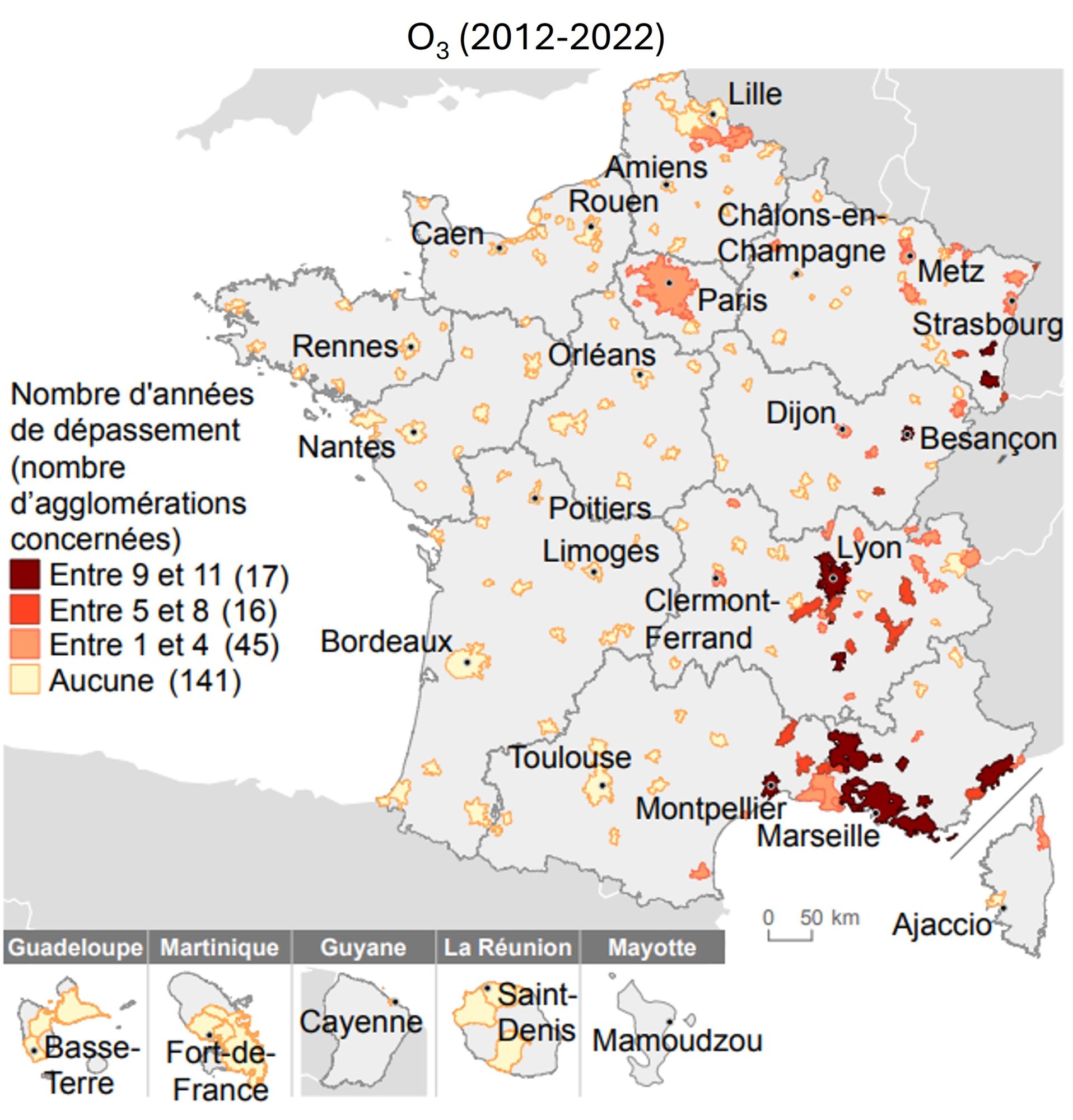 - O3 : "Sur la même période, cinq agglomérations ont mesuré chaque année des concentrations en O3 supérieures au seuil réglementaire fixé pour la protection de la santé : Avignon, Marseille – Aix-en-Provence, Mulhouse, Nice, Plan-d’Aups-Sainte-Baume".