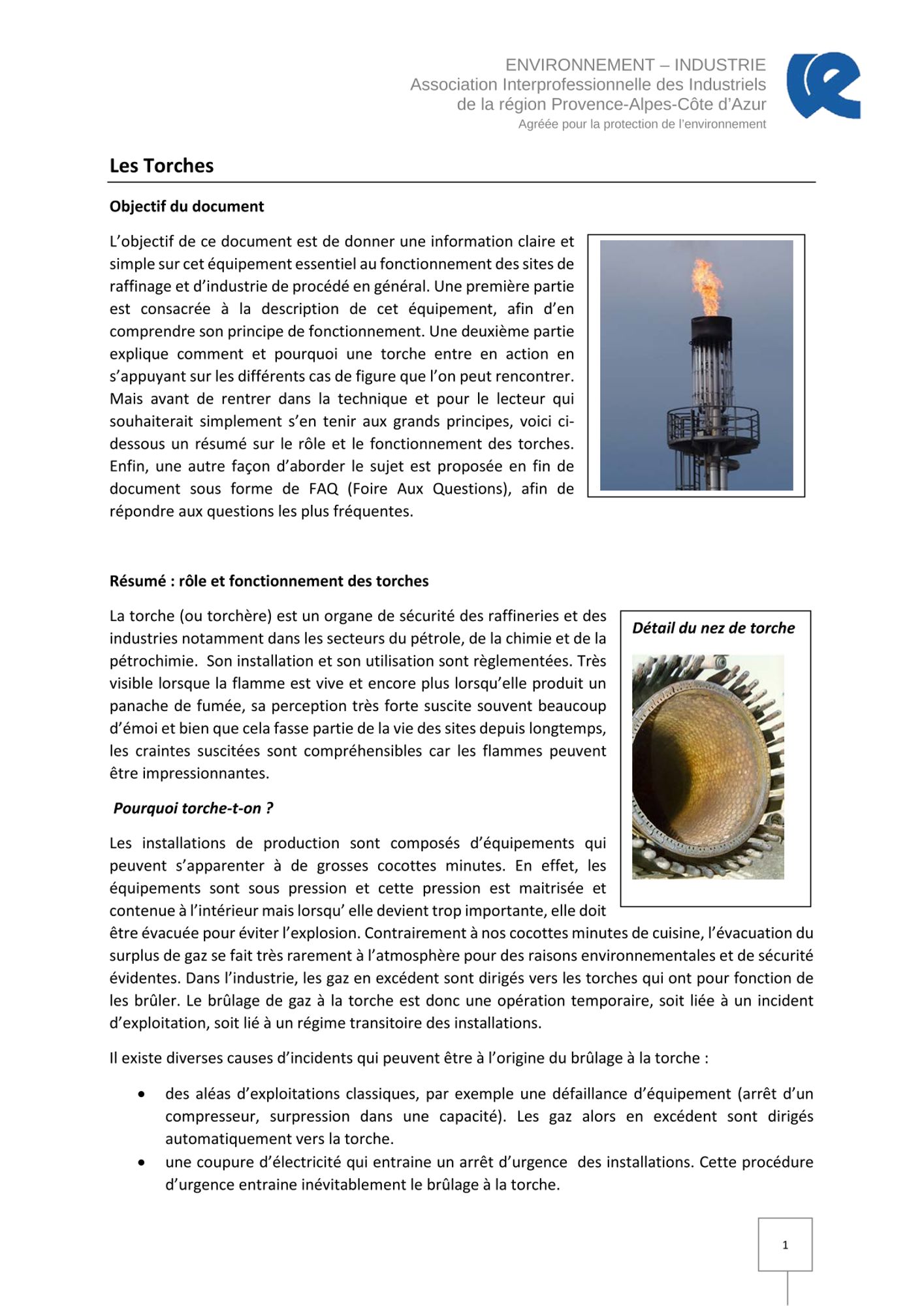La torche (ou torchère) est un organe de sécurité des raffineries et des industries notamment dans les secteurs du pétrole, de la chimie et de la pétrochimie. Son installation et son utilisation sont règlementées. Très visible lorsque la flamme est vive et encore plus lorsqu’elle produit un panache de fumée, sa perception très forte suscite souvent beaucoup d’émoi. Bien que cela fasse partie de la vie des sites depuis longtemps, les craintes suscitées sont compréhensibles car les flammes peuvent être impressionnantes.