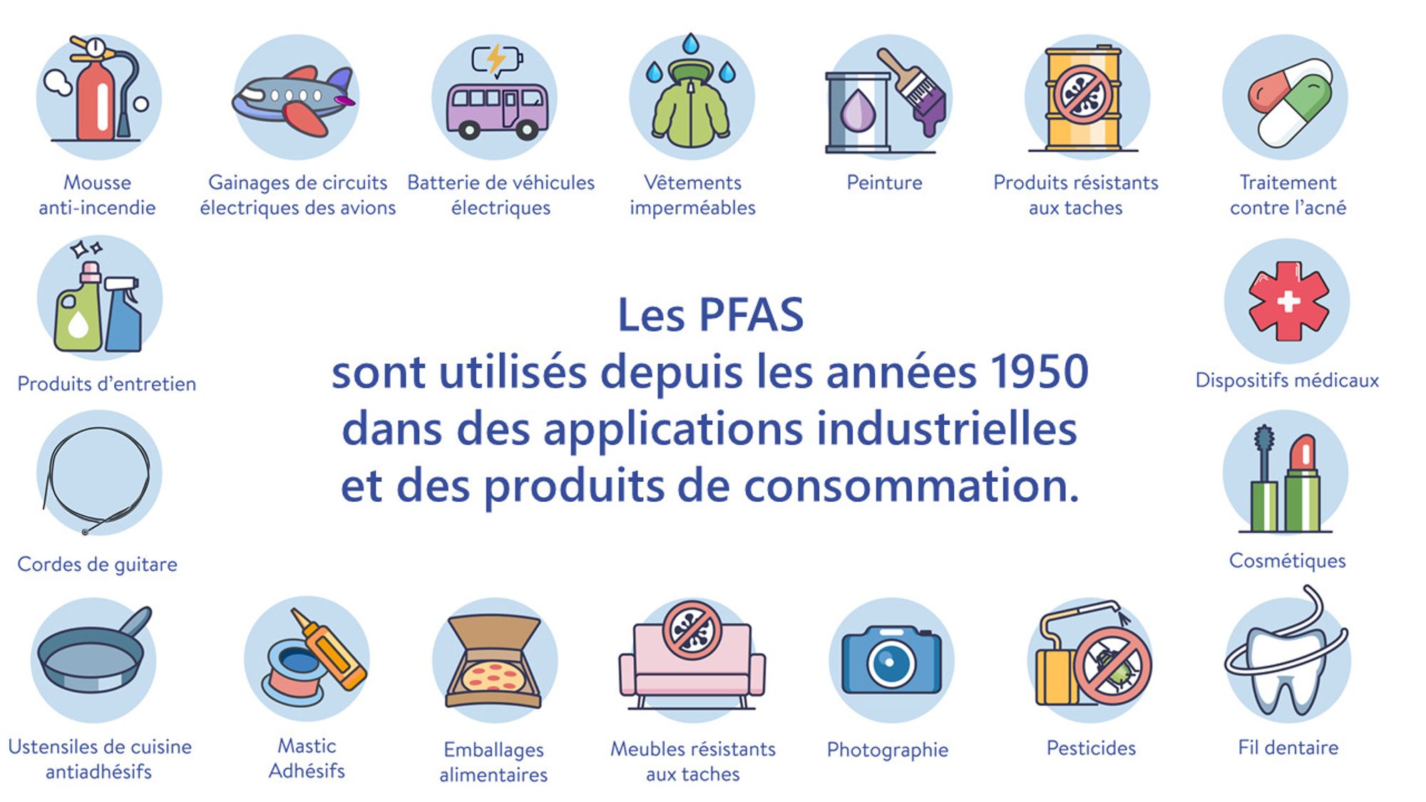 Résistants aux températures élevées, aux UV, imperméabilisantes, les PFAS sont largement utilisés depuis les années 1950 dans divers domaines industriels dans de nombreux produits de consommation courante.
