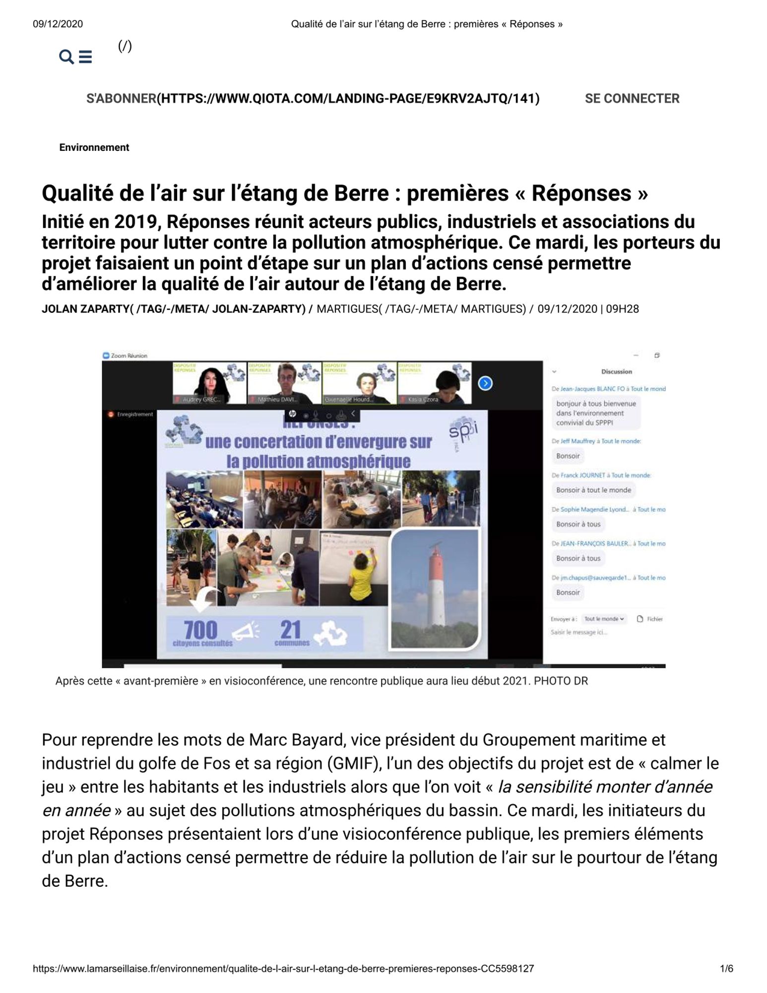 Initié en 2019, Réponses réunit acteurs publics, industriels et associations du territoire pour lutter contre la pollution atmosphérique. Ce mardi, les porteurs du projet faisaient le point d'étape sur un plan d'actions censé permettre d'améliorer la qualité de l'air autour de l'étang de Berre.