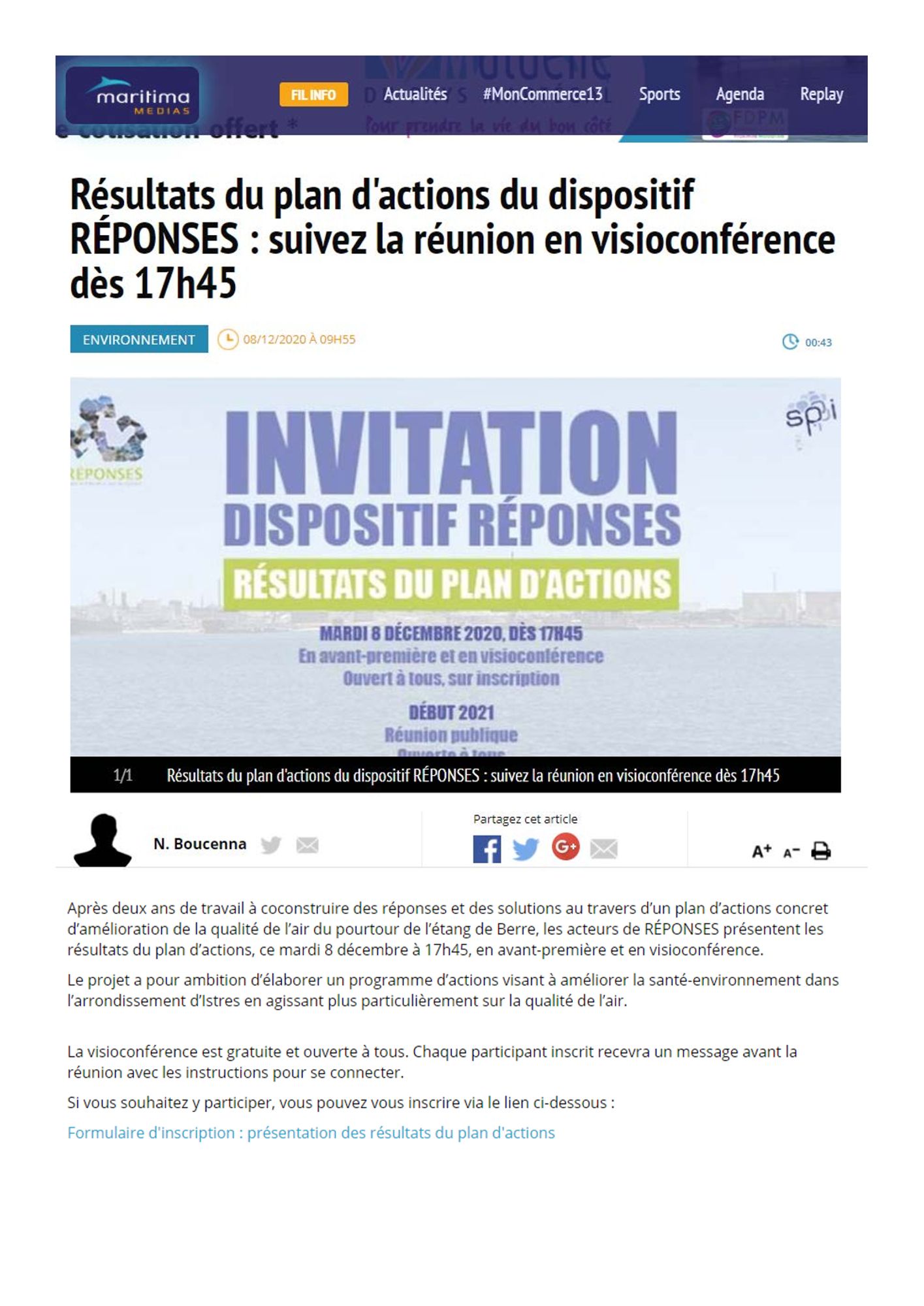 Après deux ans de travail à coconstruire des réponses et des solutions au travers d’un plan d’actions concret d’amélioration de la qualité de l’air du pourtour de l’étang de Berre, les acteurs de RÉPONSES présentent les résultats du plan d’actions, ce mardi 8 décembre à 17h45, en avant-première et en visioconférence.