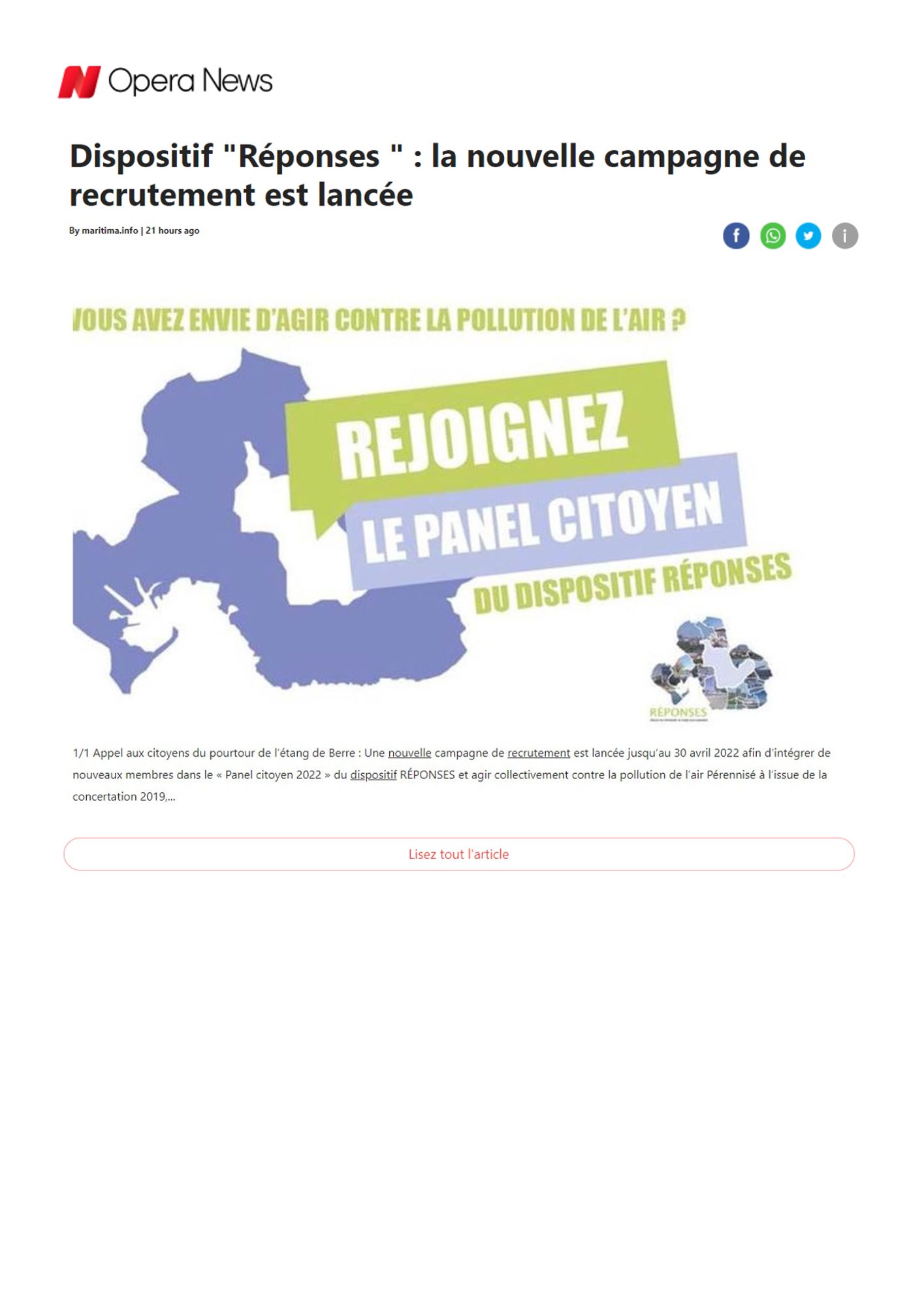 Appel aux citoyens du pourtour de l’étang de Berre : Une nouvelle campagne de recrutement est lancée jusqu’au 30 avril 2022 afin d’intégrer de nouveaux membres dans le « Panel citoyen 2022 » du dispositif RÉPONSES et agir collectivement contre la pollution de l’air.
