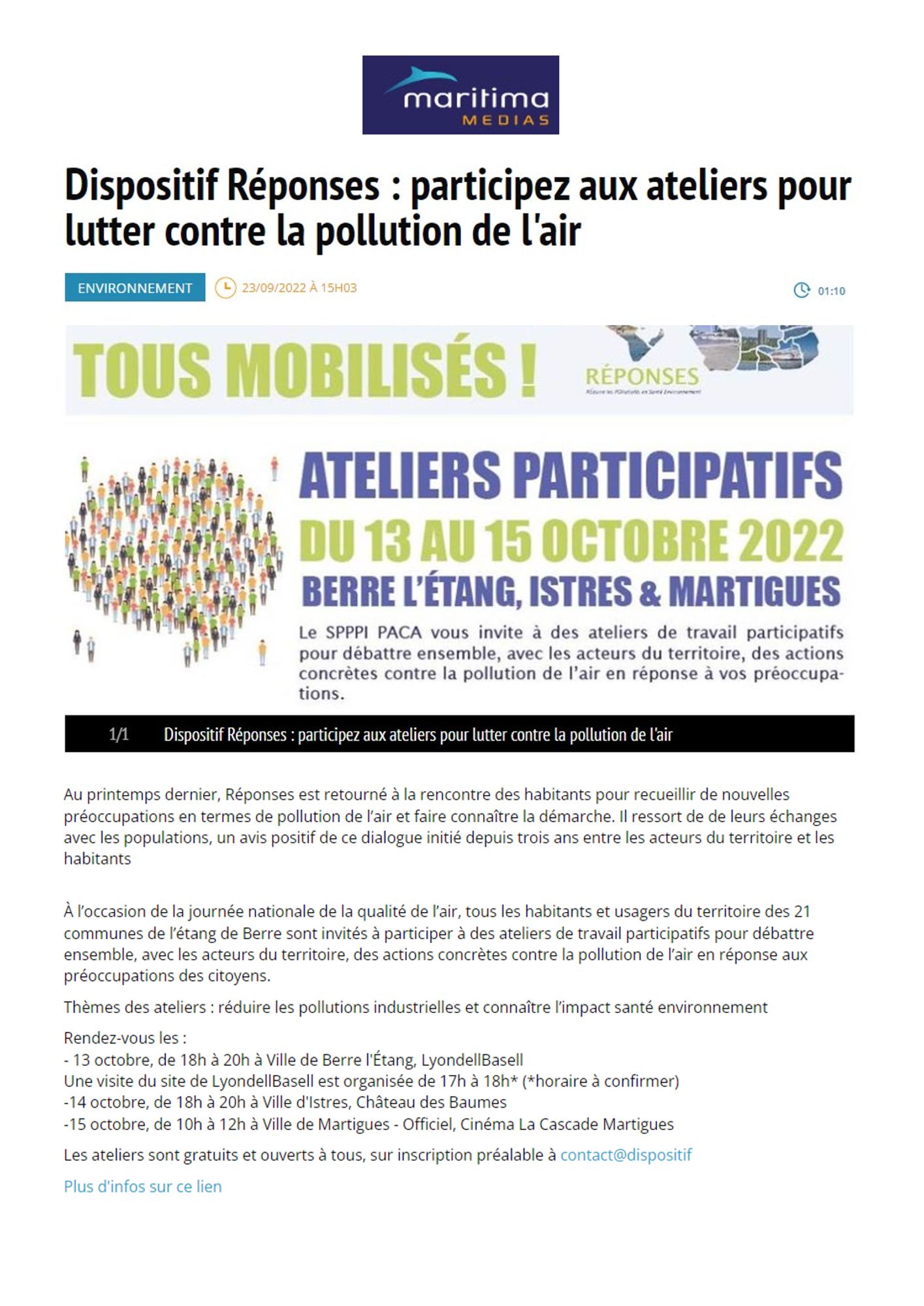 À l’occasion de la journée nationale de la qualité de l’air, tous les habitants et usagers du territoire des 21 communes de l’étang de Berre sont invités à participer à des ateliers de travail participatifs pour débattre ensemble, avec les acteurs du territoire, des actions concrètes contre la pollution de l’air en réponse aux préoccupations des citoyens.