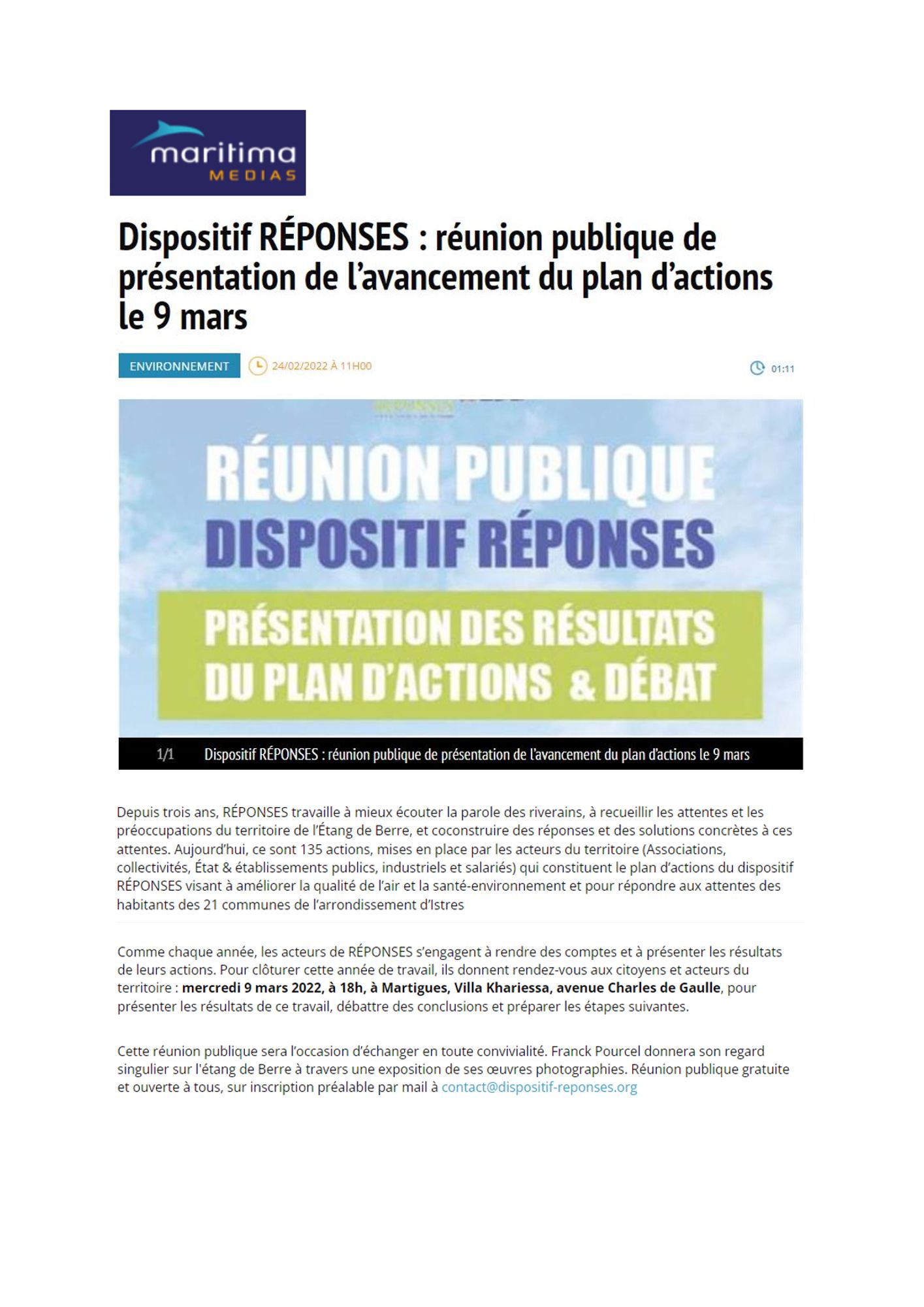 Dispositif RÉPONSES : réunion publique de présentation de l'avancement du plan d'actions le 9 mars