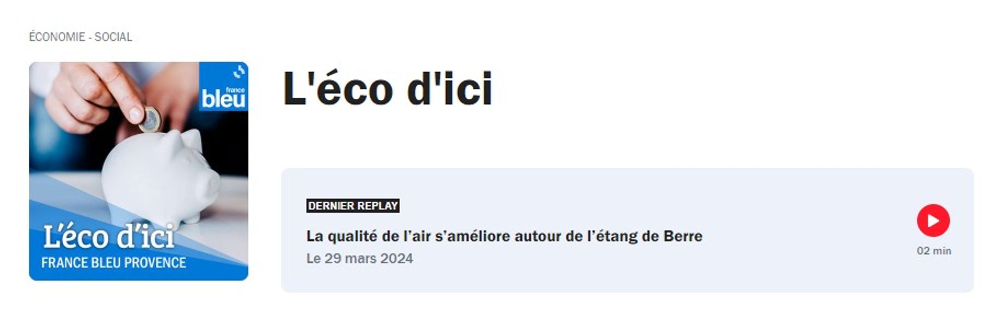 La qualité de l’air s’améliore autour de l’étang de Berre France Bleu Provence, 29 mars 2024 Écouter la chronique : Écouter la chronique sur francebleu.fr