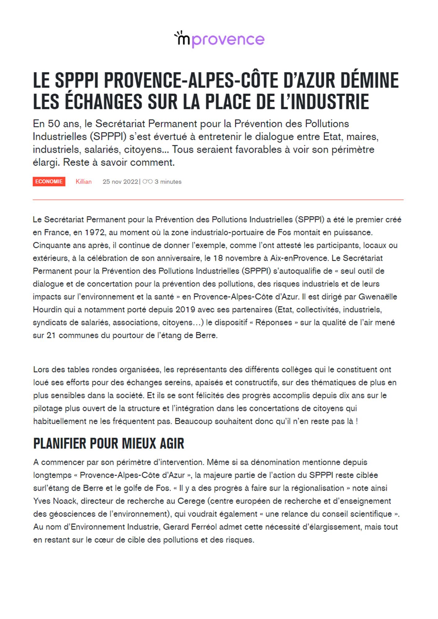 Le SPPPI PACA démine les échanges sur la place de l'industrie MProvence, 25 novembre 2022 Avec "Réponses", le SPPPI a posé les bases du dialogue. Lire l'article : Le SPPPI PACA démine les échanges sur la place de l'industrie (MProvence, 25 novembre 2022) (351.6 Ko) Lire l'article sur mprovence.com
