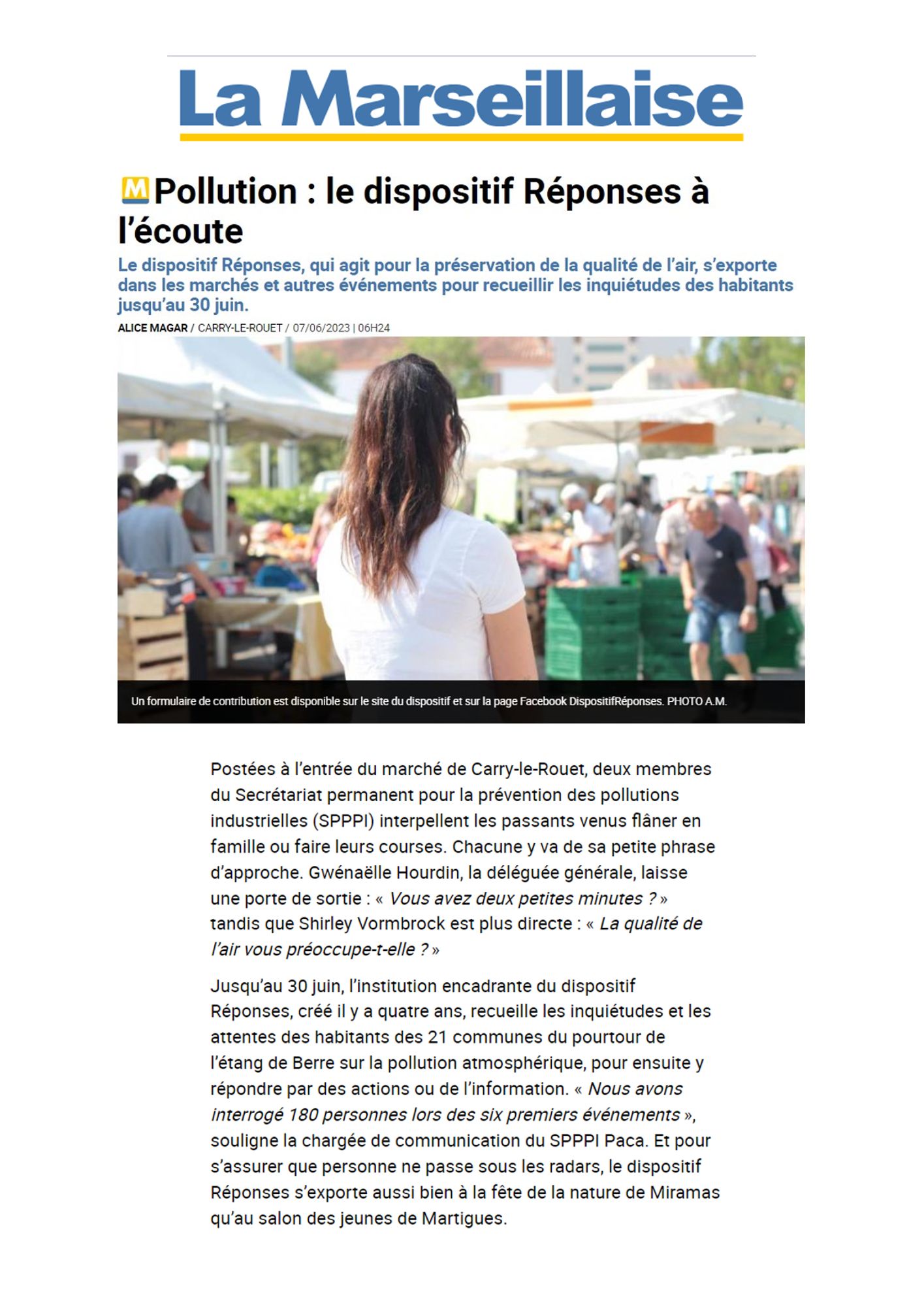 Jusqu’au 30 juin, l’institution encadrante du dispositif Réponses, créé il y a quatre ans, recueille les inquiétudes et les attentes des habitants des 21 communes du pourtour de l’étang de Berre sur la pollution atmosphérique, pour ensuite y répondre par des actions ou de l’information.