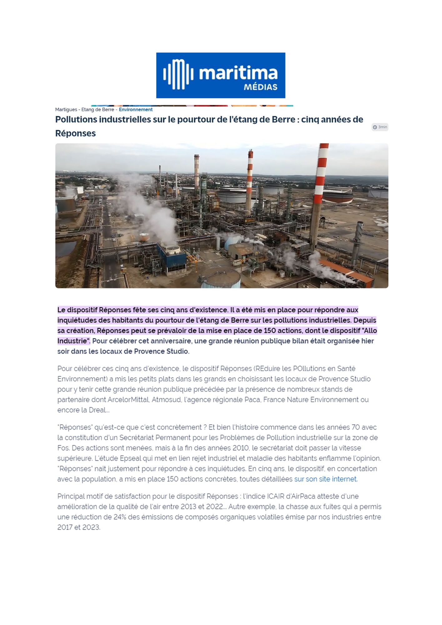 Le dispositif Réponses fête ses cinq ans d'existence. Il a été mis en place pour répondre aux inquiétudes des habitants du pourtour de l'étang de Berre sur les pollutions industrielles. Depuis sa création, Réponses peut se prévaloir de la mise en place de 150 actions, dont le dispositif "Allo Industrie".