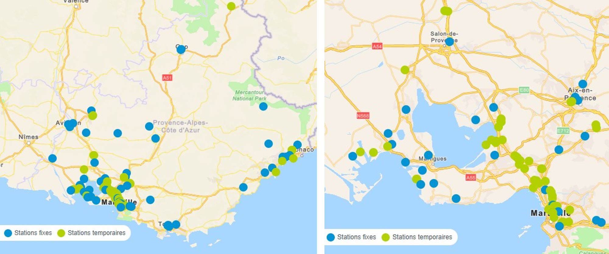 Réseau de stations de surveillance de la qualité de l’air déployé par AtmoSud en région PACA, et notamment autour de l’étang de Berre (source : AtmoSud)