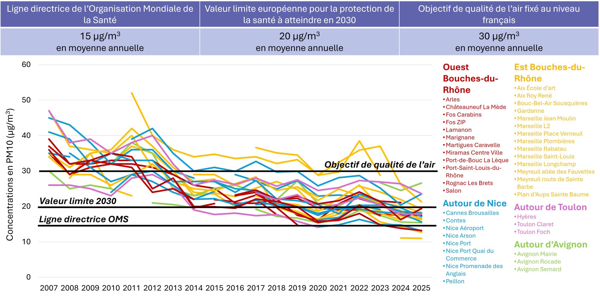 Évolution des moyennes annuelles des concentrations en PM10 (µg/m3) mesurées au niveau des stations de surveillance d’AtmoSud depuis 2007 (source : AtmoSud)