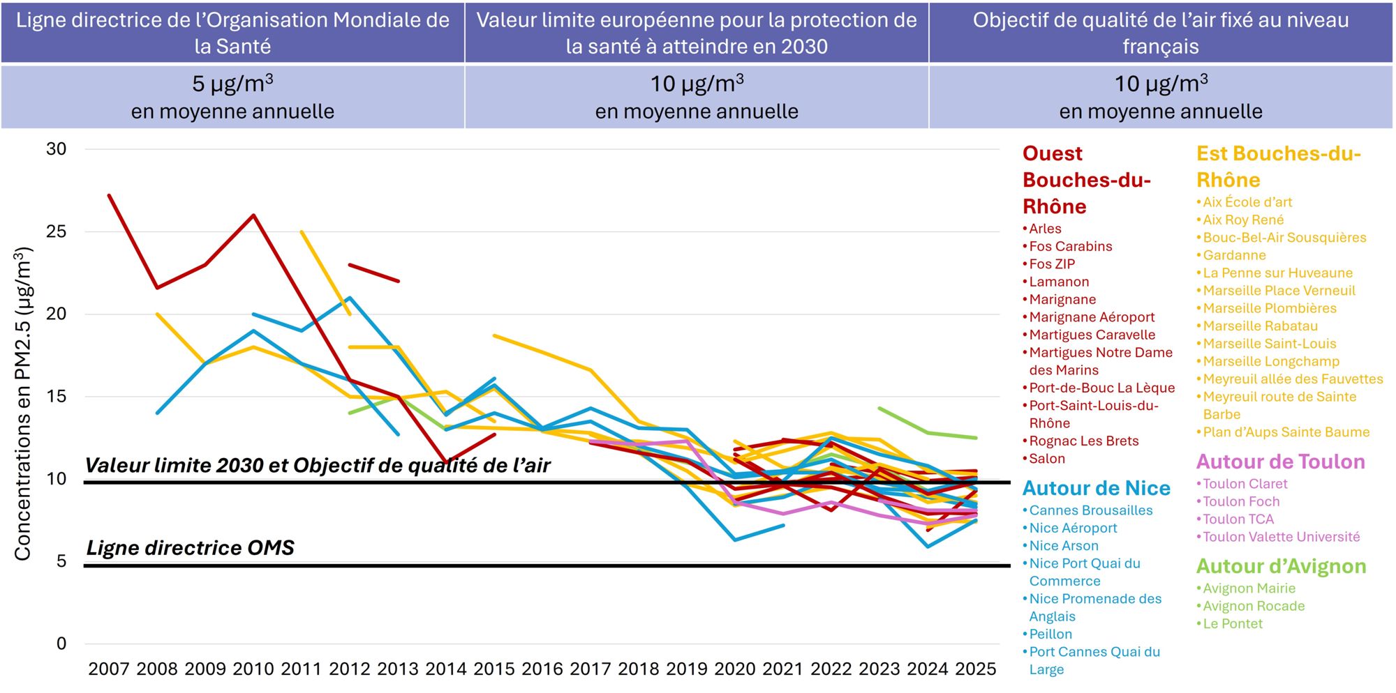 Évolution des moyennes annuelles des concentrations en PM2.5 (µg/m3) mesurées au niveau des stations de surveillance d’AtmoSud depuis 2007 (source : AtmoSud)