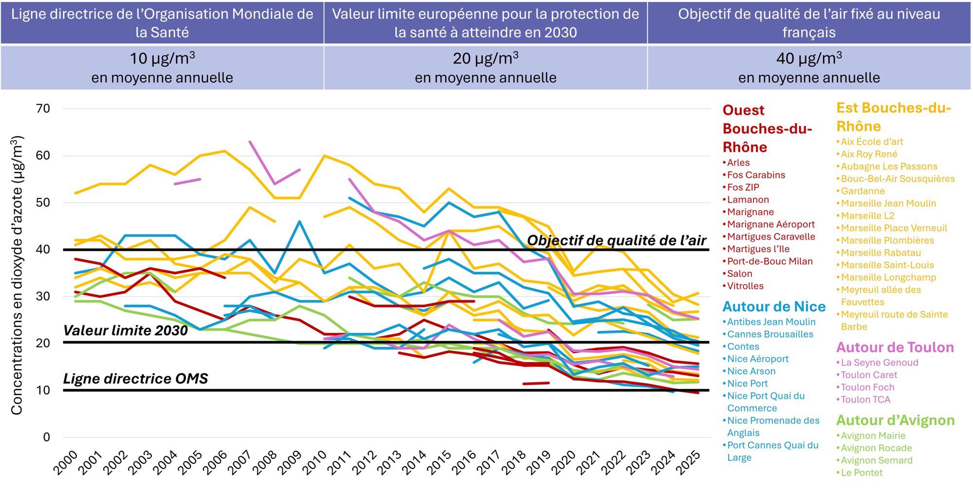 Une diminution globale des concentrations en dioxyde d’azote est mesurée depuis 2000 au niveau des stations de surveillance d’AtmoSud. En 2025, les niveaux de pollution en dioxyde d’azote de l’ensemble des stations se situent en dessous de l’objectif de qualité de l’air fixé en France.