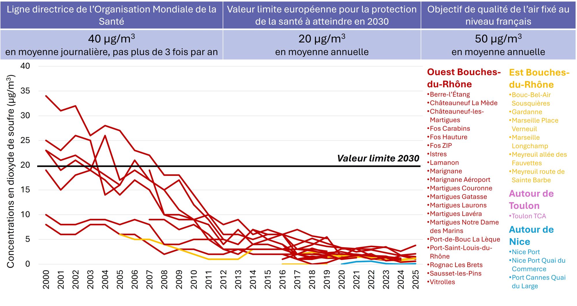 Une diminution globale importante des concentrations en dioxyde de soufre est mesurée depuis 2000 au niveau des stations de surveillance d’AtmoSud. Depuis 2008, les niveaux de pollution en dioxyde de soufre de la totalité des stations se situent en dessous de la valeur limite pour la protection de la santé.